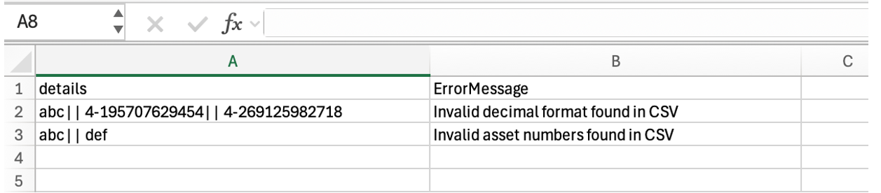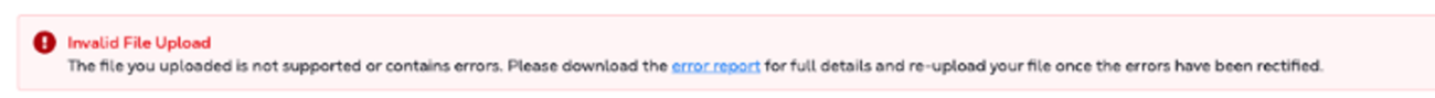 If the uploaded .CSV file contains unaccepted data, click the error report link that displays in the Invalid File Upload error message.