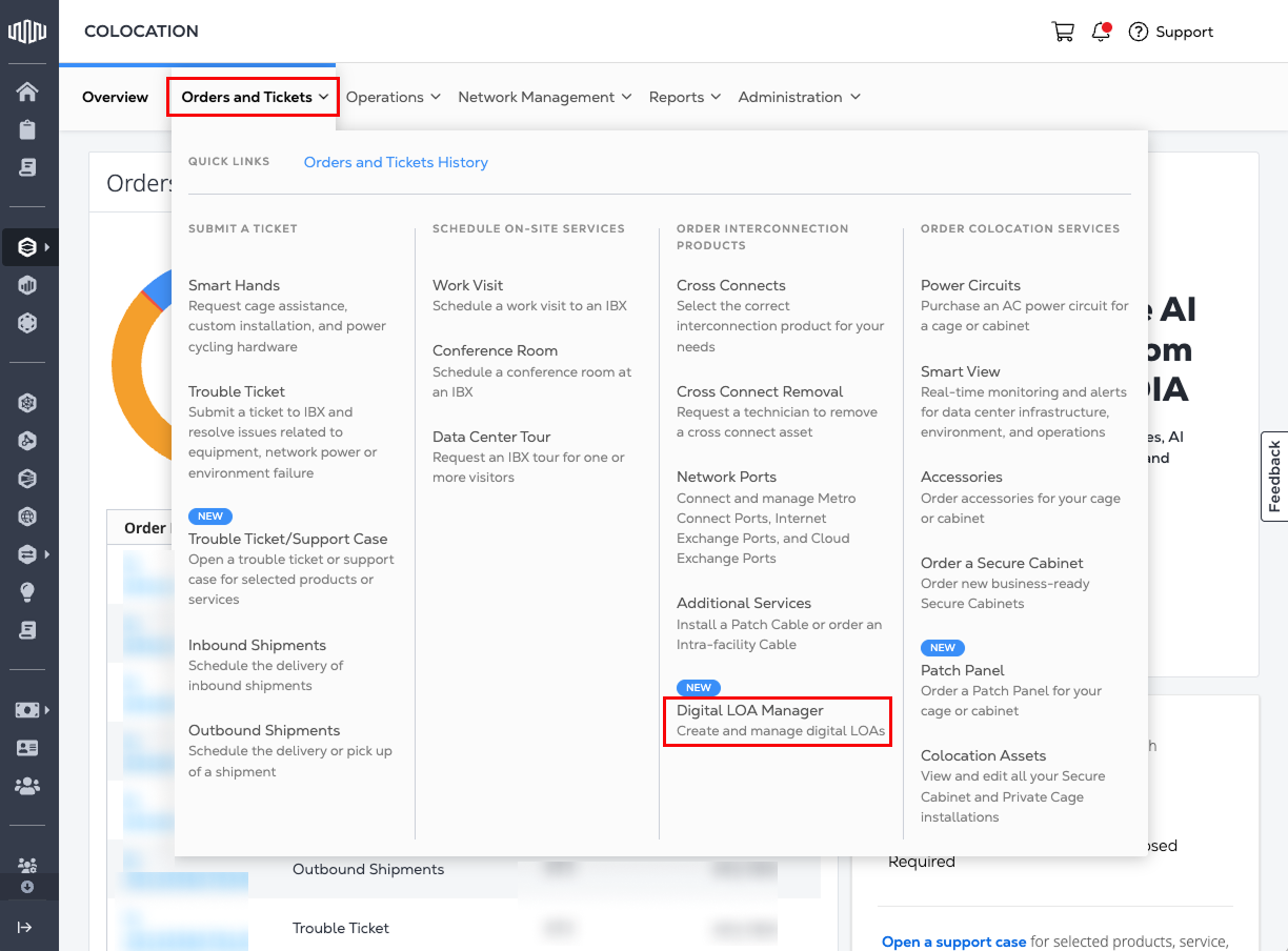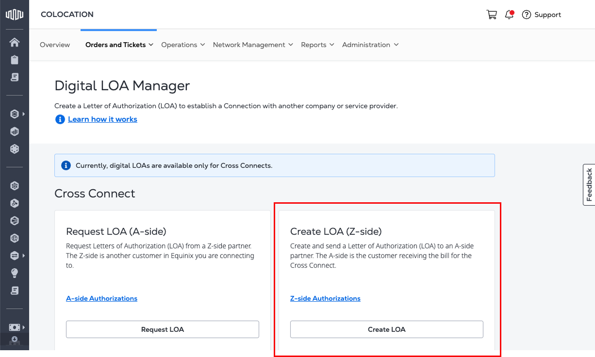 For instructions on using the digital LOA to order a new connection, see uploading an LOA file when ordering a Cross Connect.