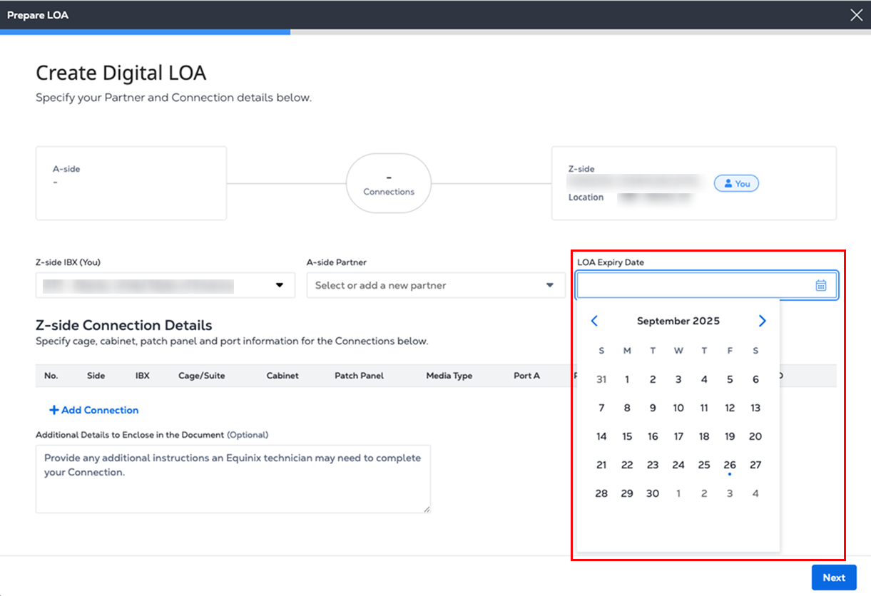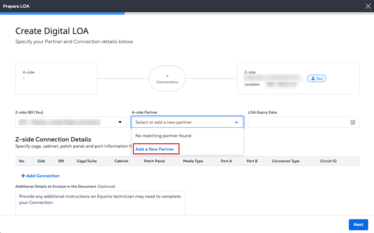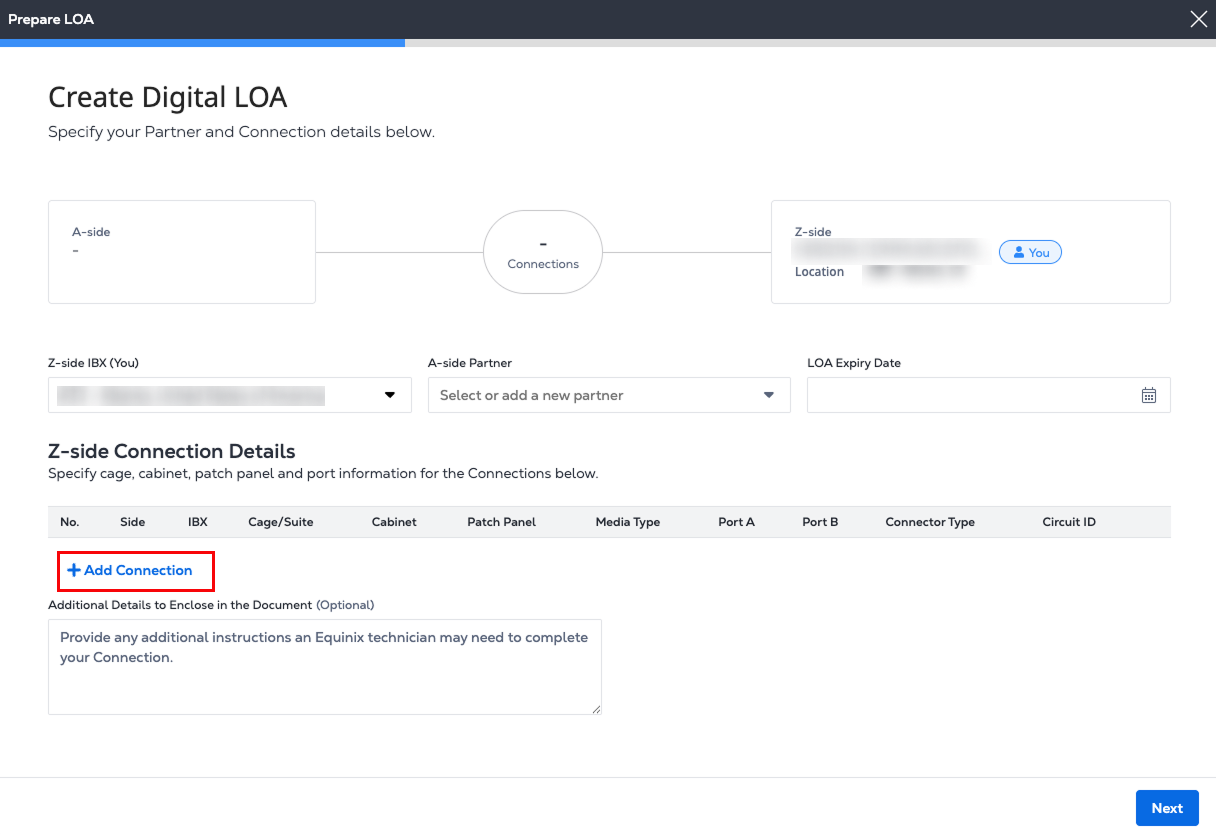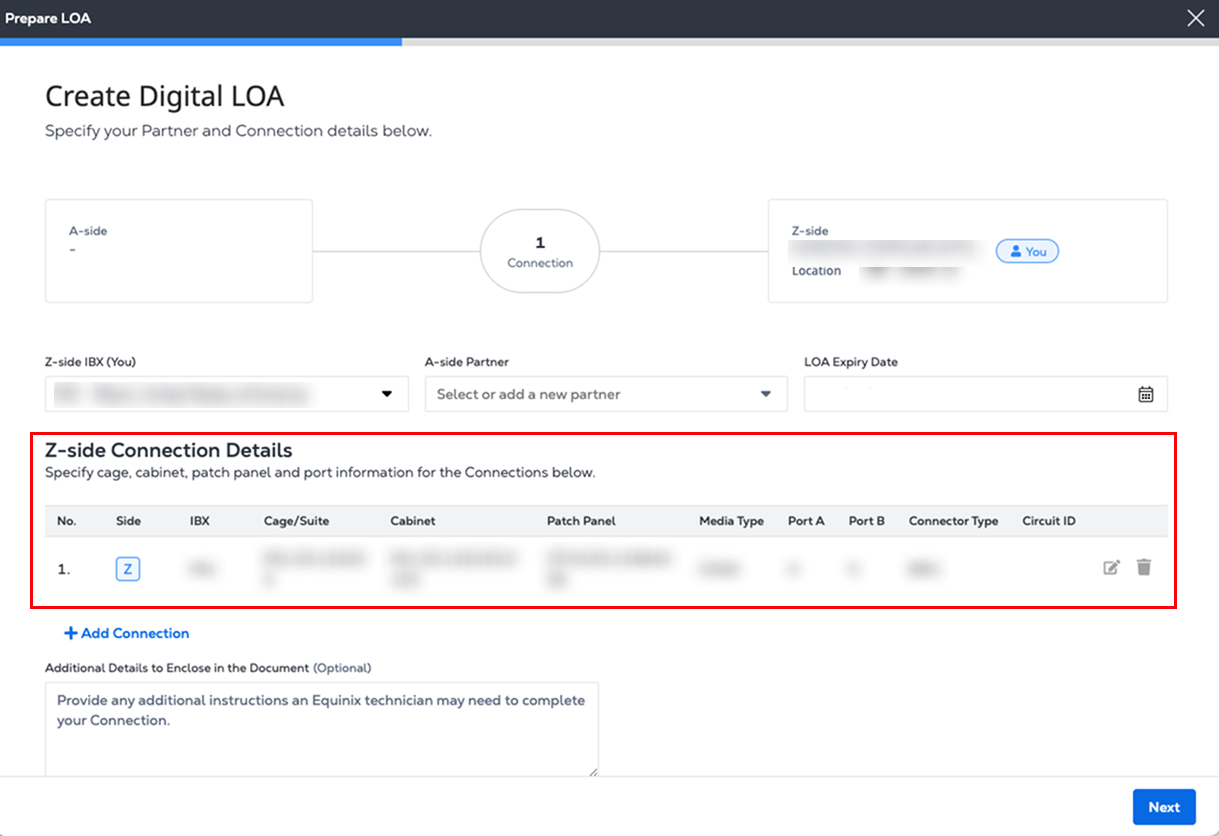 Fill in your connection details: IBX, cage, cabinet, patch panel, ports, and other connection attributes. The Digital LOA reserves the specified assets. This ensures that the ports are available to complete the connection process.