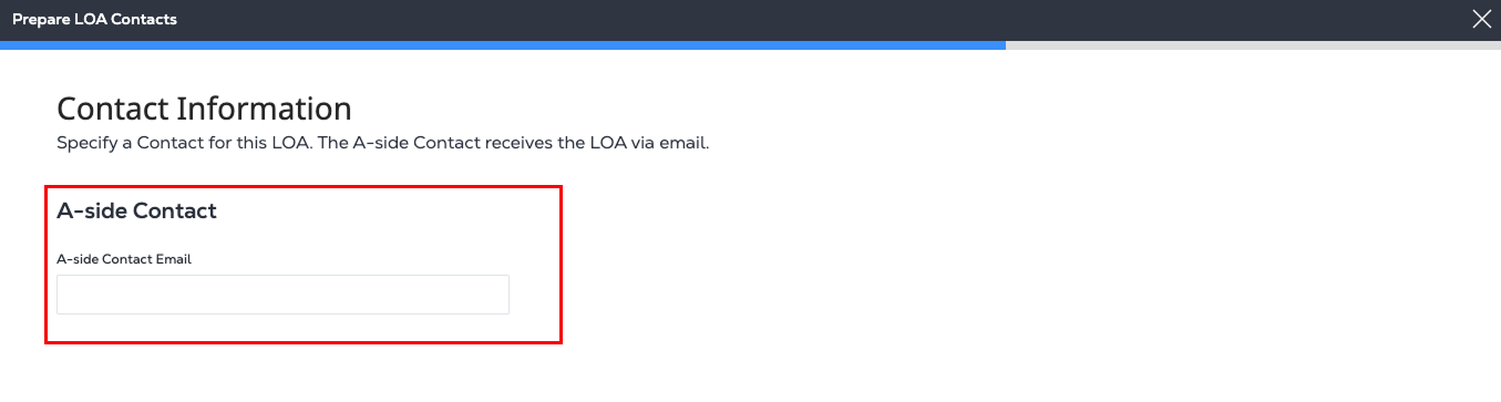 In the A-side Contact List section, add the A-side contact’s email address. If you need to add more than one contact, click Add Additional Email to include multiple A-side contacts. Once the LOA is created, it is emailed to all listed A-side contacts.