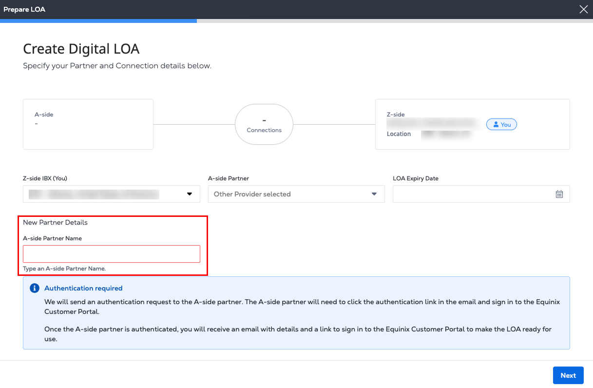 A Digital LOA must be created and approved before a Cross Connect can be established between the A-side and Z-side partners.