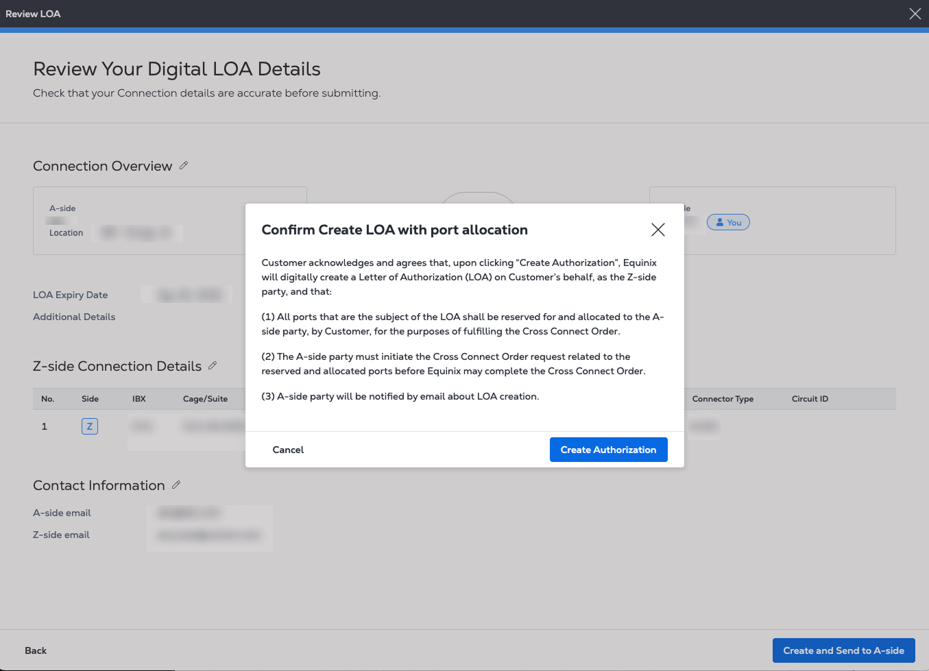 In the Confirm Create LOA with port allocation window, click Create Authorization.