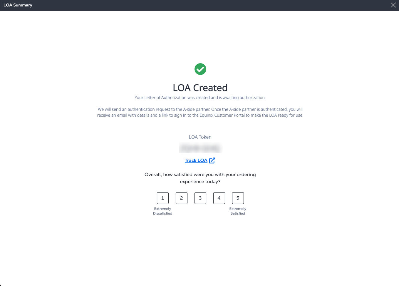 The LOA Summary contains the LOA Token number which is a unique ID for the Digital LOA across the PDF, email, and in the Customer Portal. Your A-side contacts receive an email notification that includes the new Digital LOA as a PDF attachment.