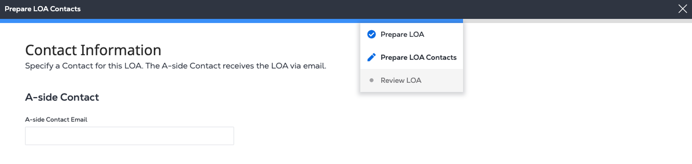 To edit this information, hover over the blue progress bar at the top of the page. In the drop-down list, click Prepare LOA or Prepare LOA Contacts to return to the previous step and make your changes.