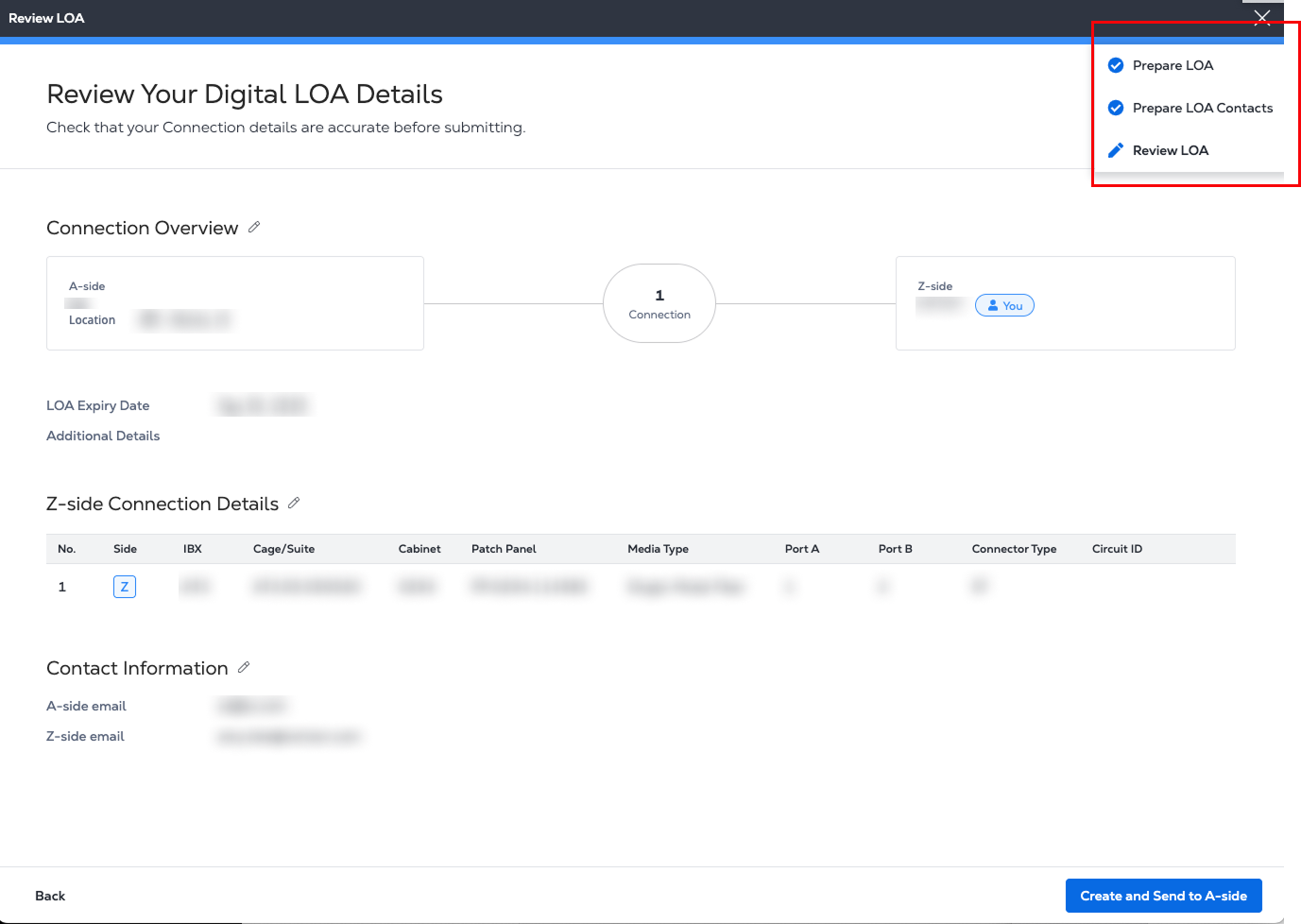 In Review Your Digital LOA Details, verify that the Z-side Connection Details and the Contact Information sections are correct.