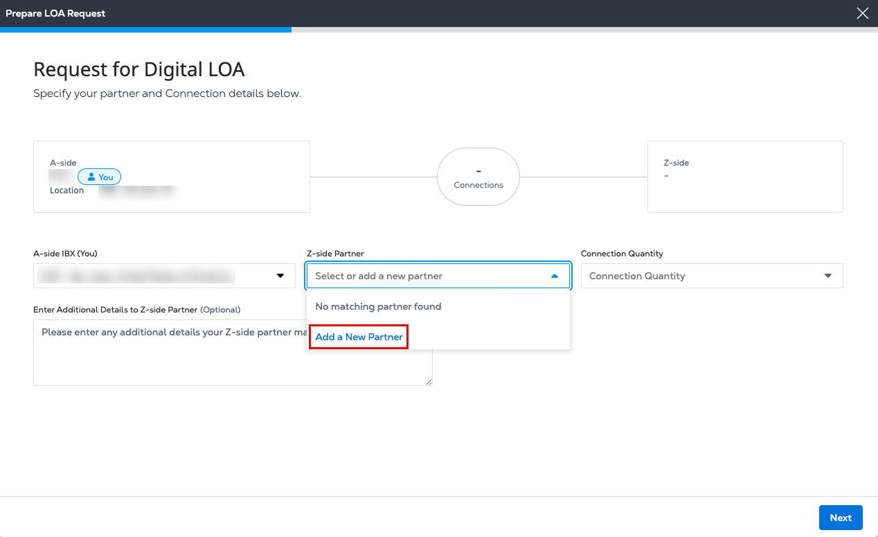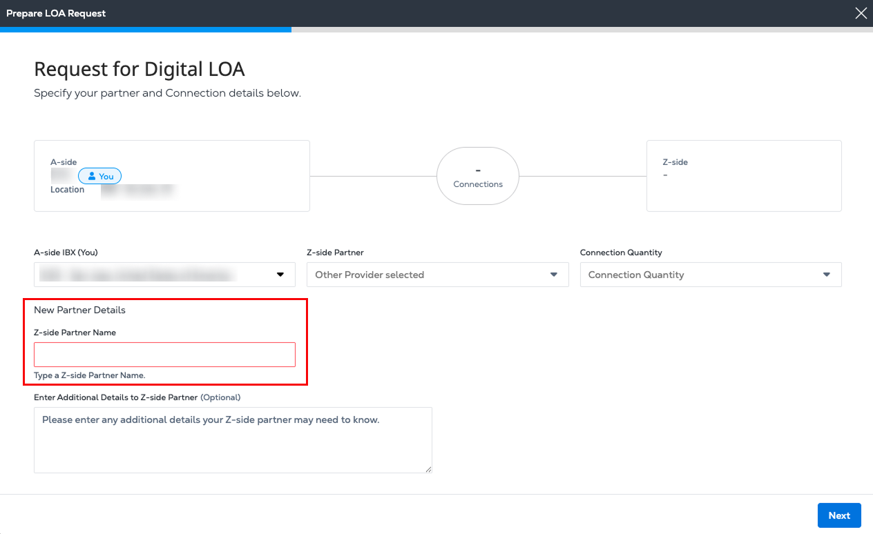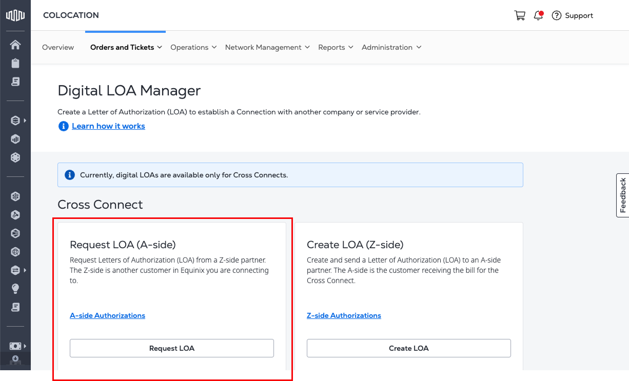 A Digital Letter of Authorization (LOA) is an electronic document that replaces traditional, manually created LOAs. It is used to initiate Cross Connects between two parties. The Digital LOA enables the A-side user to order a Cross Connect by requesting authorization from a Z-side partner through the Customer Portal.