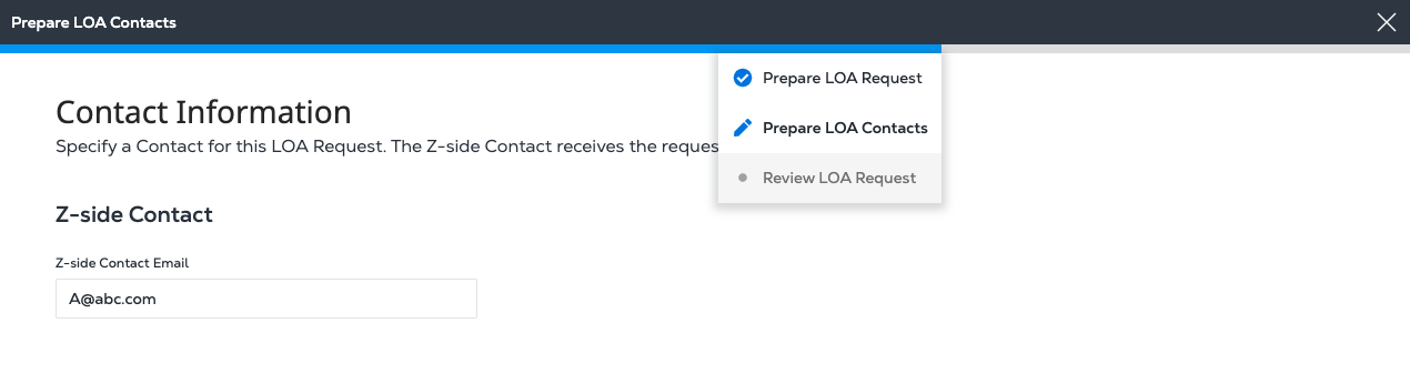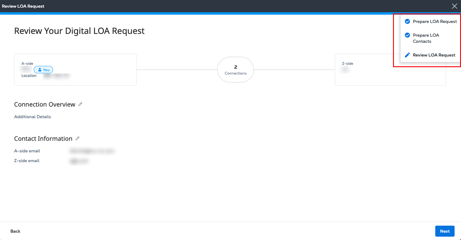 To edit this information, hover over the blue progress bar at the top of the page. In the drop-down list, click Prepare LOA Request or Prepare LOA Contacts to return to the previous step and make your changes.