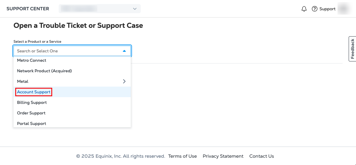 Under Select a Product or Service, select Account Support from the dropdown list.