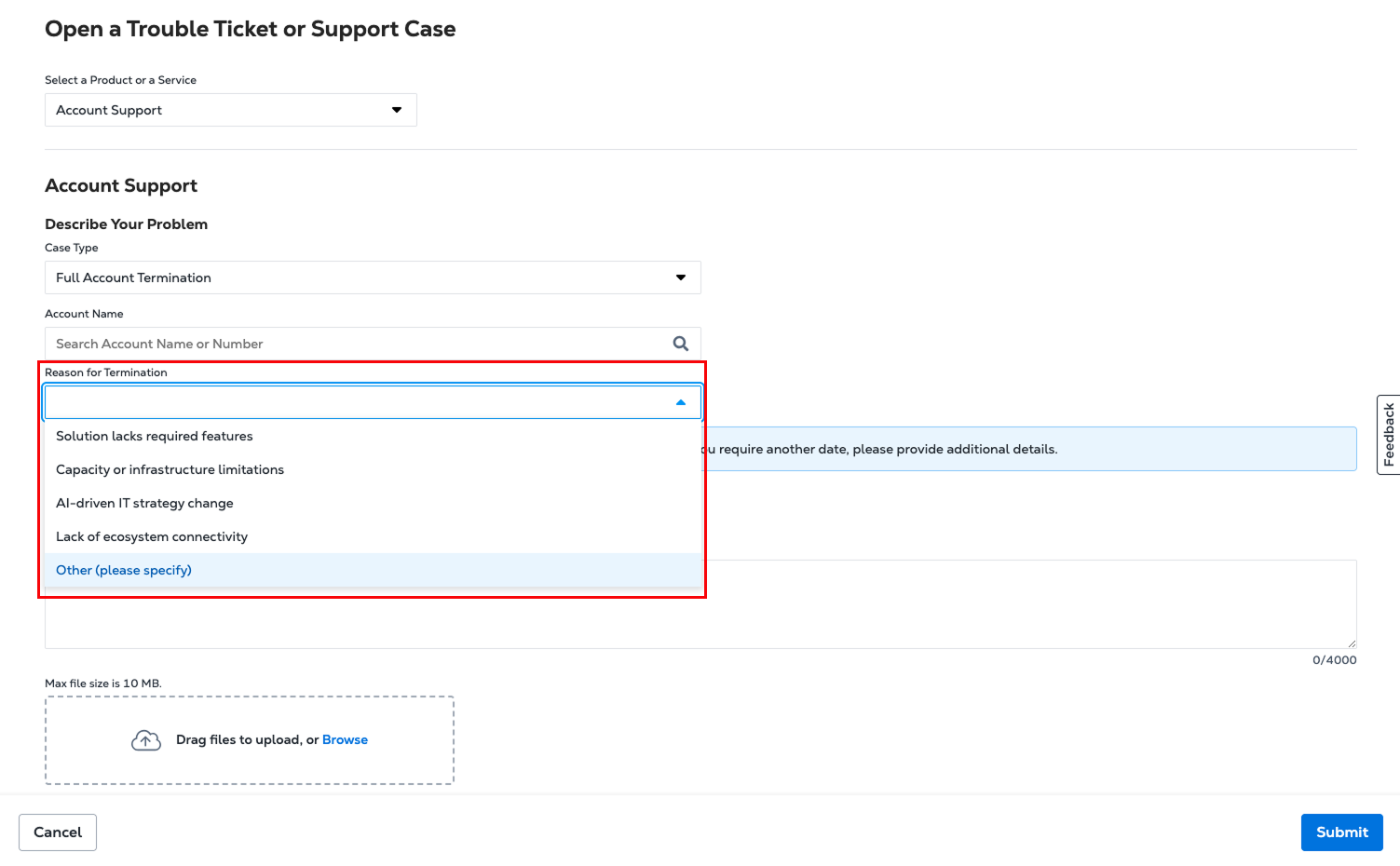 Submit a termination request for an account, deployment, or product/service, by opening a support case.