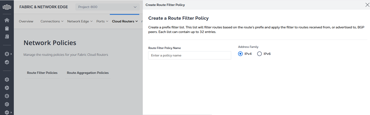 IPv4orIPv6for the Address Family. If you are creating a Route Aggregation Policy,IPv4is already selected by default. -