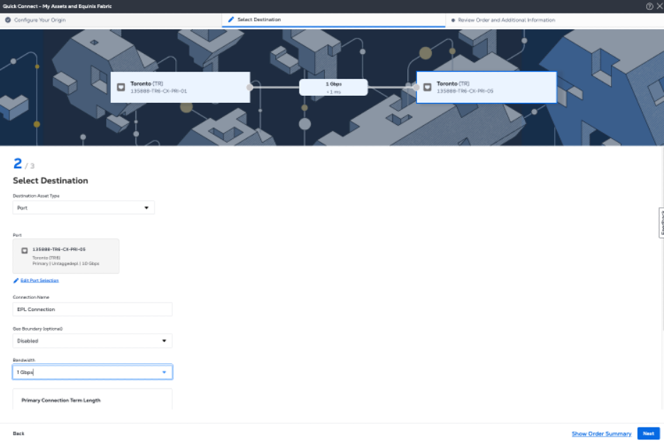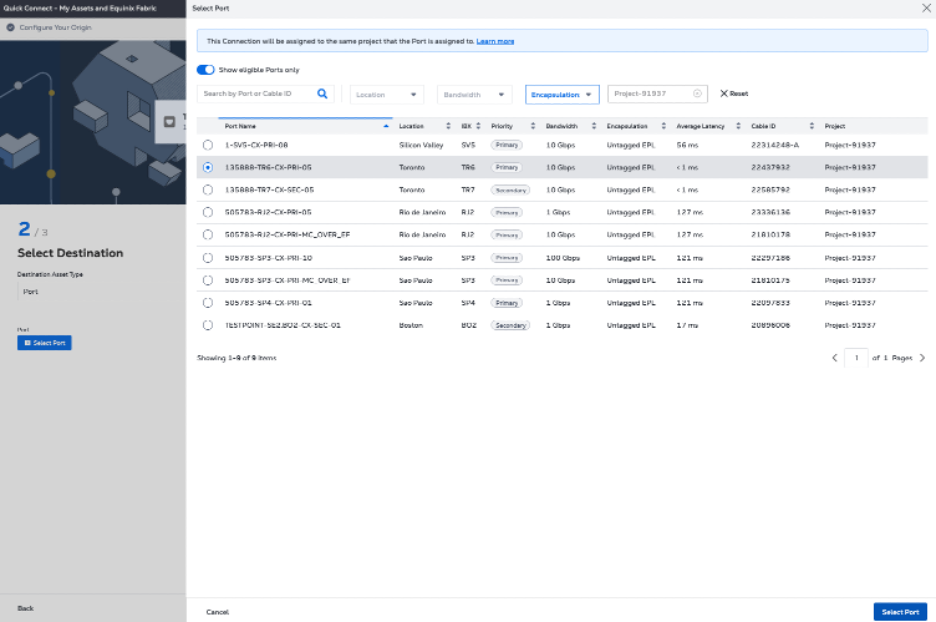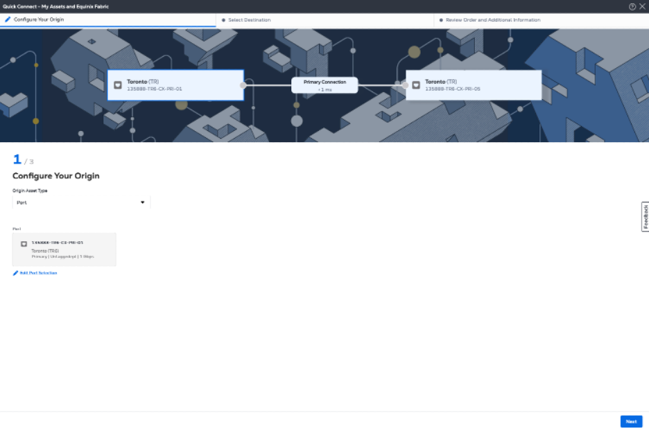 Select the port in the desired metro from the port inventory slide-out screen, and click Next.