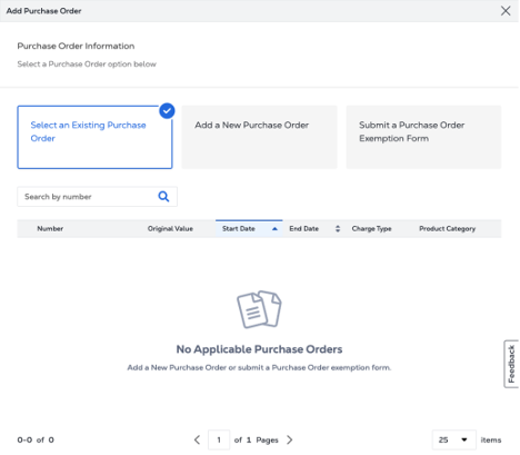 (Optional) Enter or add order information in the Purchase Order section. Select the Purchase Order number you want to add to your order, then click Done.
