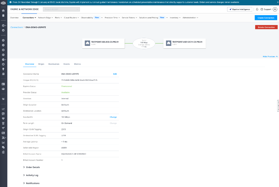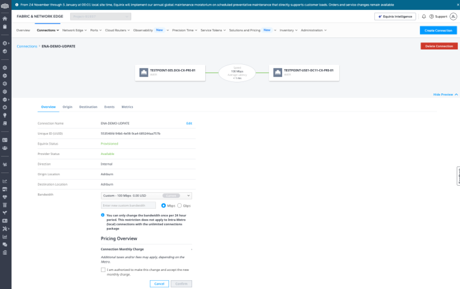 The same connection cannot be resized again within a 24-hour period. This restriction exists because of how Equinix updates connection billing and invoicing, each change triggers a billing update, and the system requires a 24-hour interval before allowing another change for the same connection.