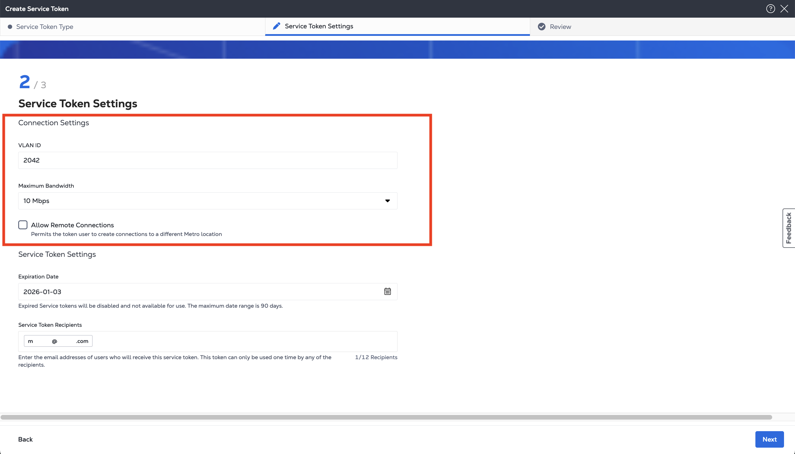 allowRemoteConnection- SettingallowRemoteConnectiontotrueallows your user or customer to create connections from your port to destinations in different Metros. Setting tofalselimits connections to destinations in the same Metro as the port.bandwidthLimit- Use thebandwidthLimitparameter to set the maximum bandwidth for a connection created using this service token.