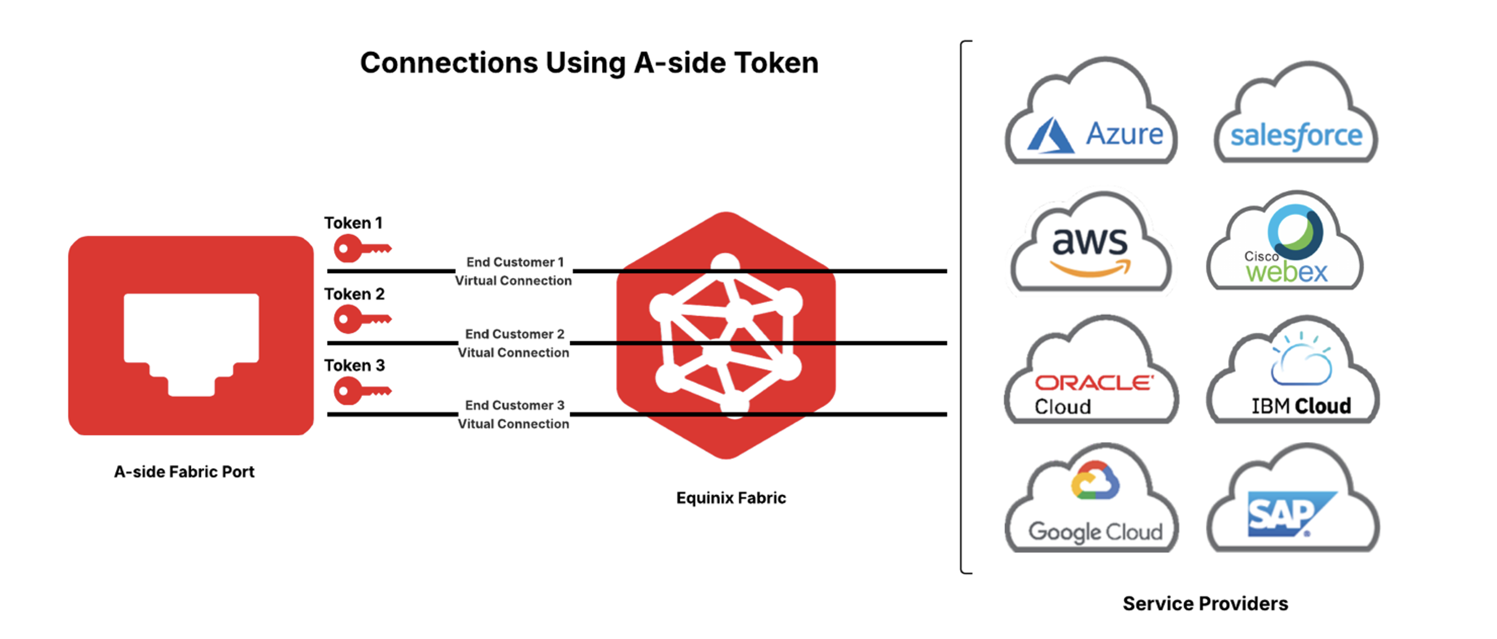 A-side tokens give your customers control of the virtual connection, allowing them to connect to destinations on Fabric from your port. It enables aggregated use of your A-side Fabric port and eliminates the need for you, the provider or reseller, to understand or be aware of unique requirements per connection.