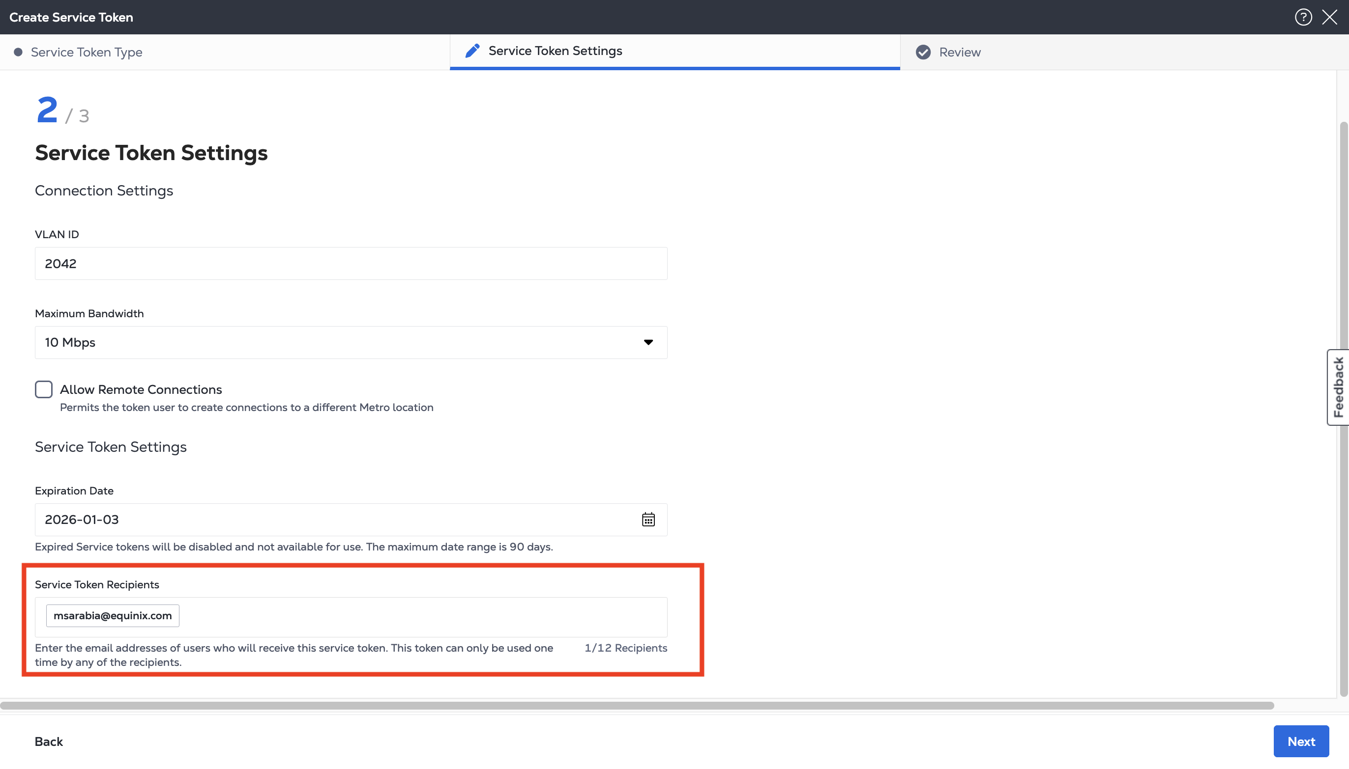 Enter the email addresses of users who will receive this service token. This token can only be used one time by any of the recipients.
