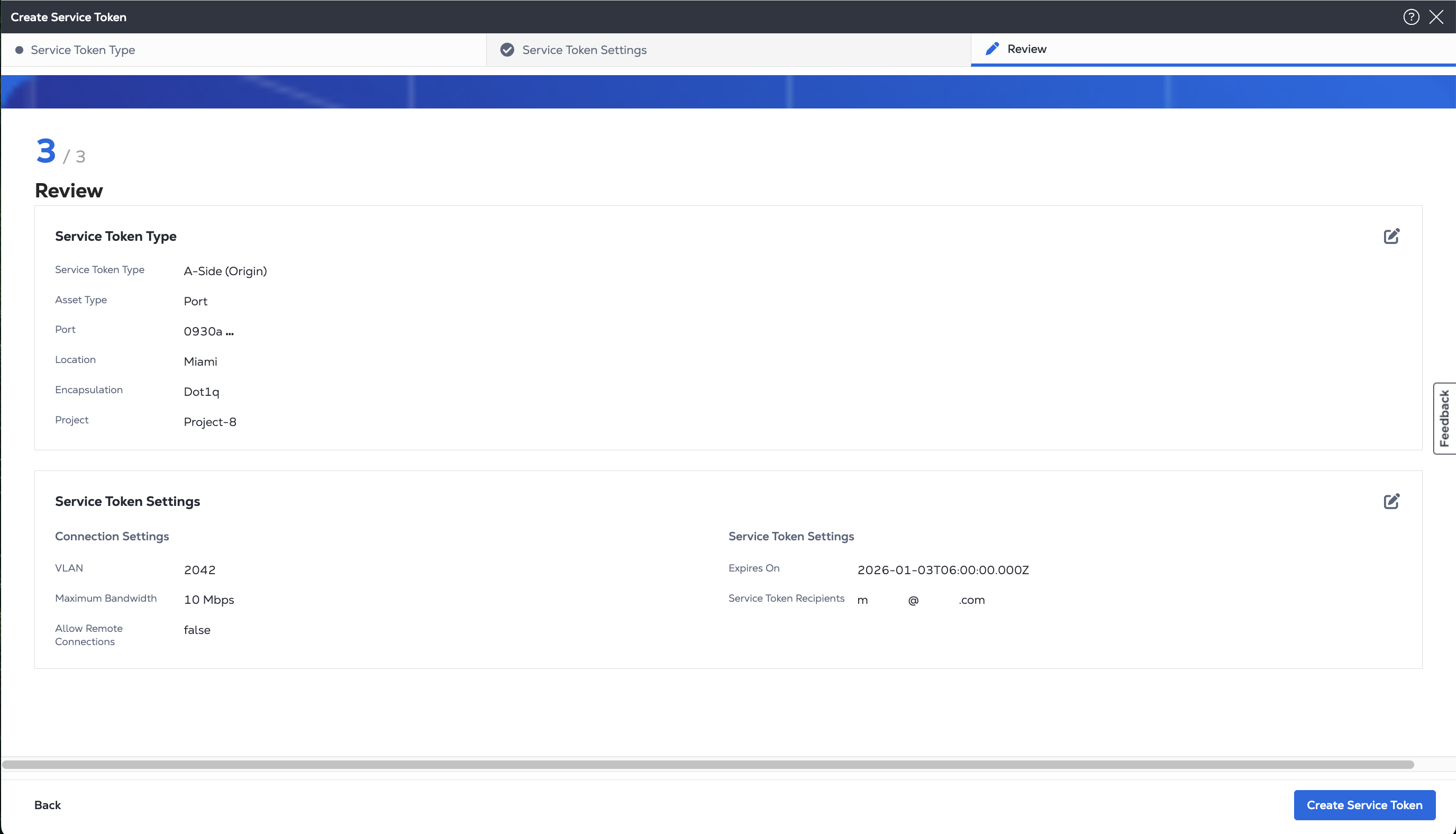 When the service token information is correct, click Create Service Token.