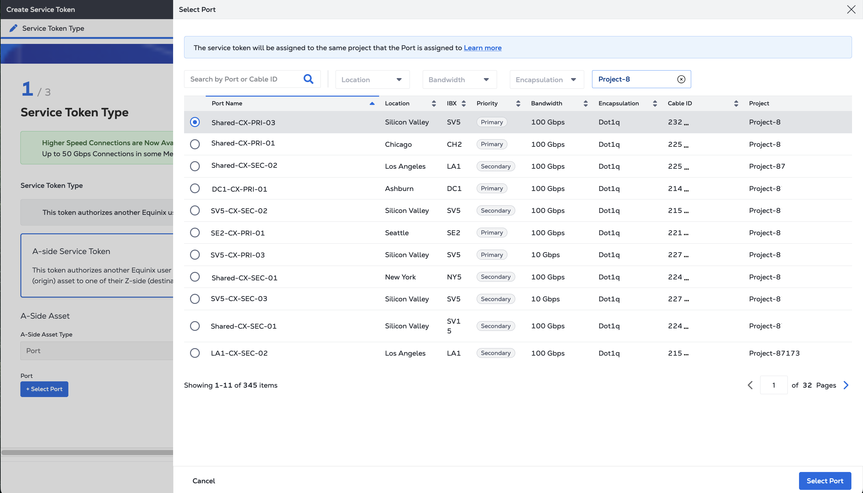 Once you create an A-side service token and share it with your user or customer, they have full permission to create a connection from the port defined by the service token. You, the creator of the A-side token and the owner of the Port, are billed for the connection made by your user or customer.