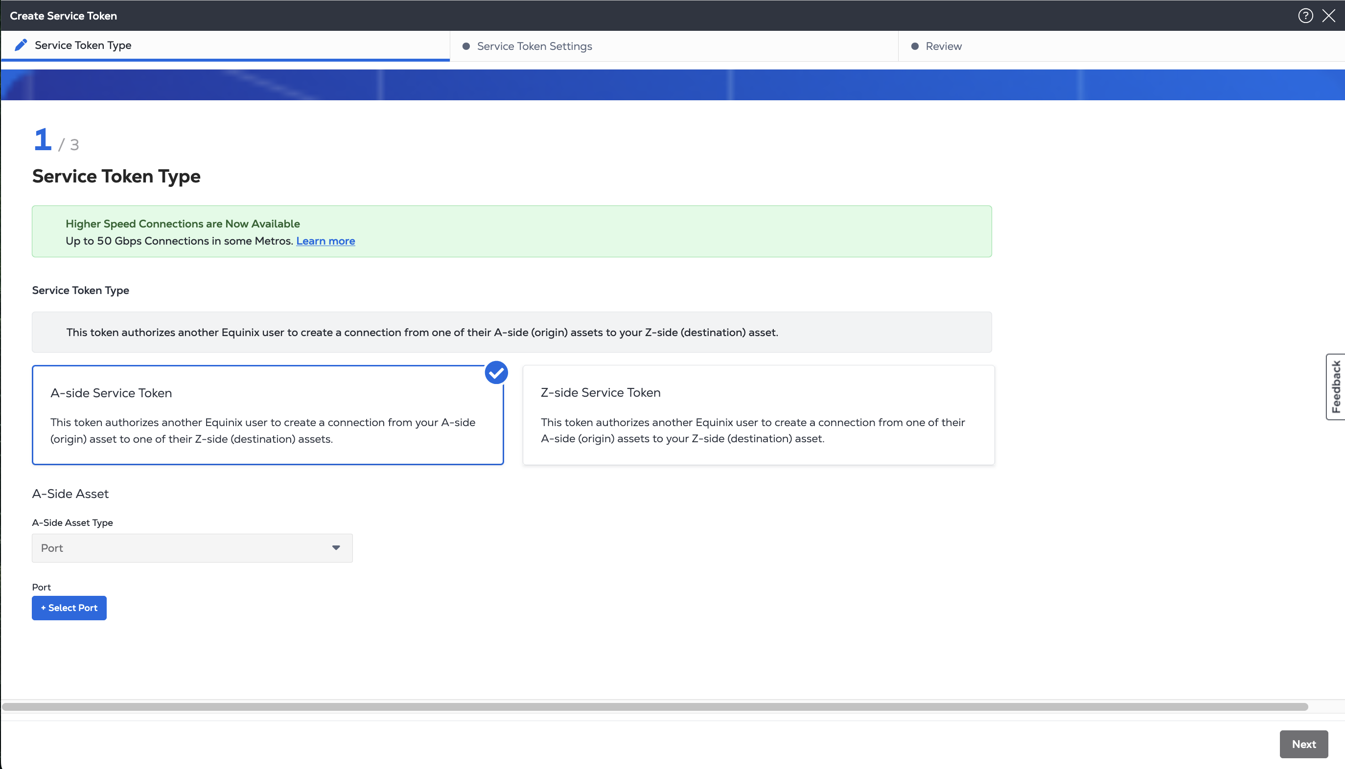 Create an A-side service token to authorize use of your Equinix Fabric port to allow your users or customers to connect to cloud providers, network providers, or any other Equinix Fabric destination. As the owner of the A-side port, you are billed for the virtual connections provisioned by your users or customers who redeem your a-side tokens.