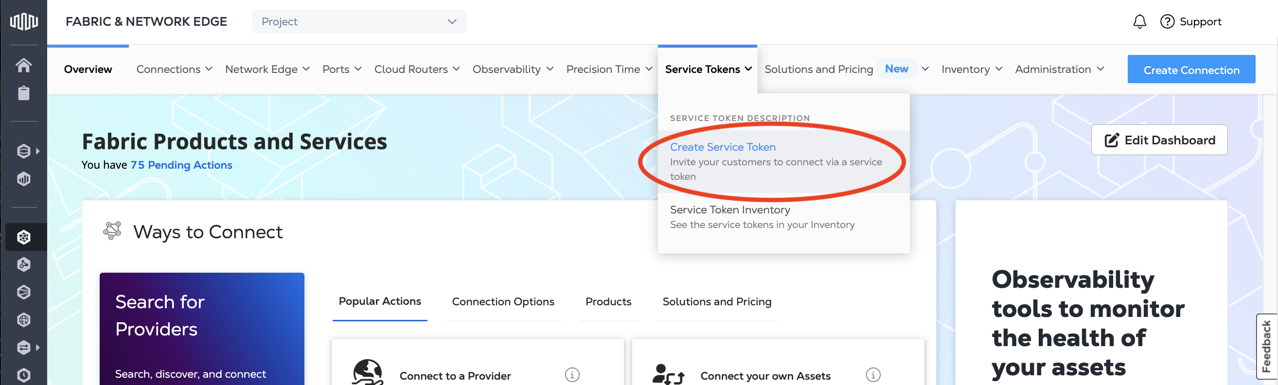 Create an A-side service token to authorize use of your Equinix Fabric port to allow your users or customers to connect to cloud providers, network providers, or any other Equinix Fabric destination. As the owner of the A-side port, you billed for the virtual connections provisioned by your users or customers who redeem your a-side tokens.