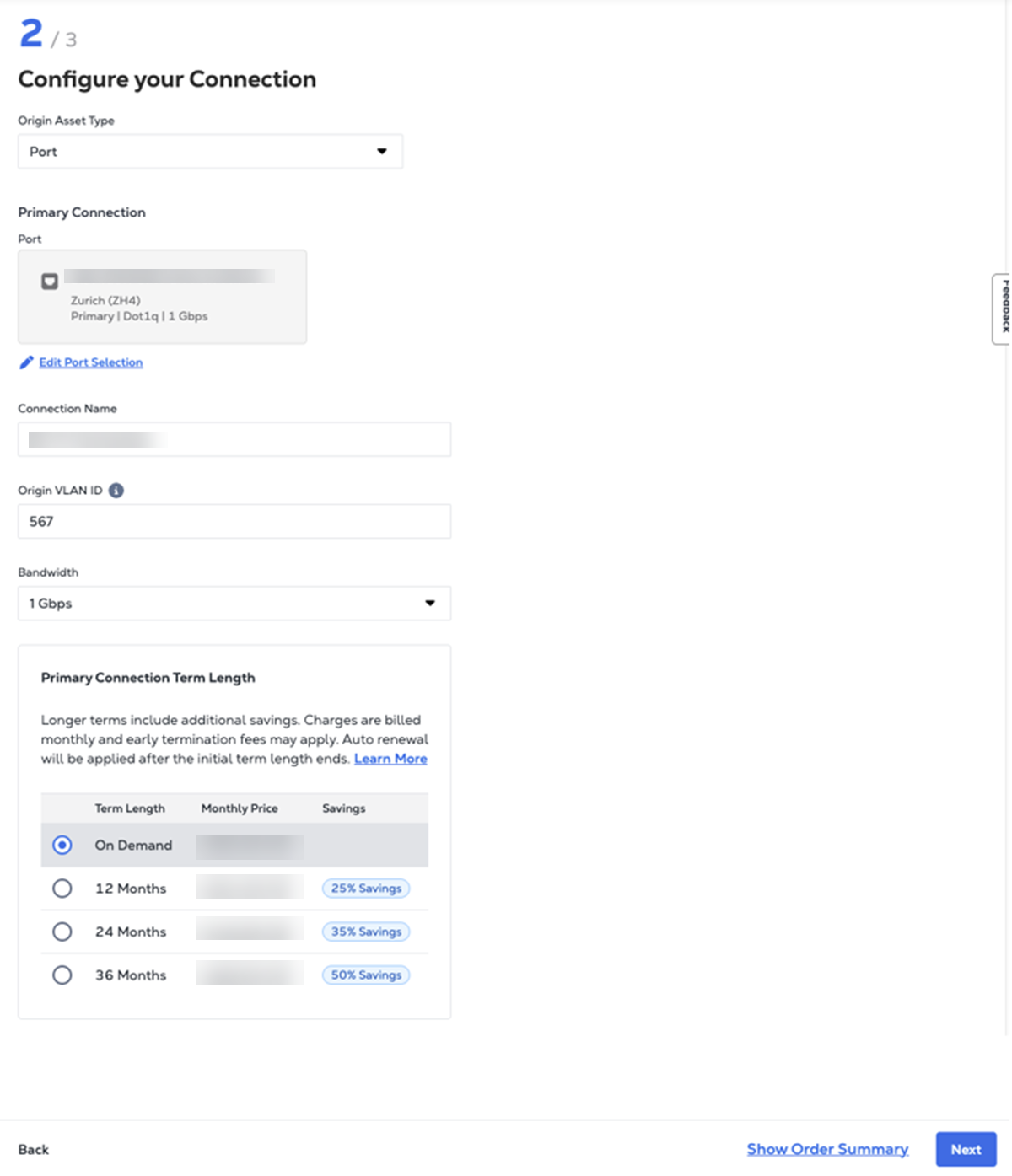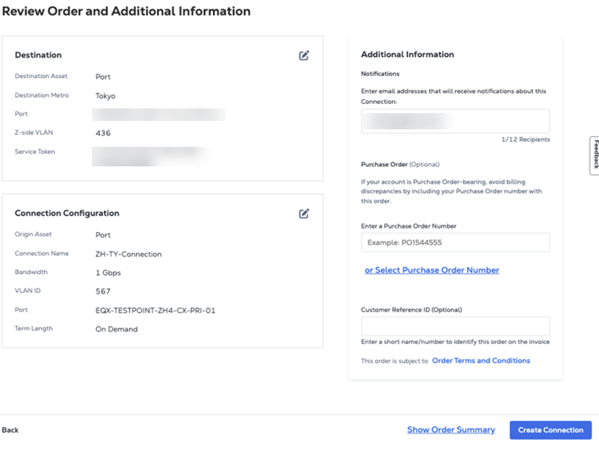 Review the order and add an additional email address (optional) for notification, a purchase order (optional) or customer reference ID (optional) if necessary and then click Create Connection.