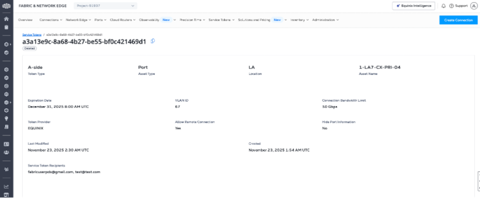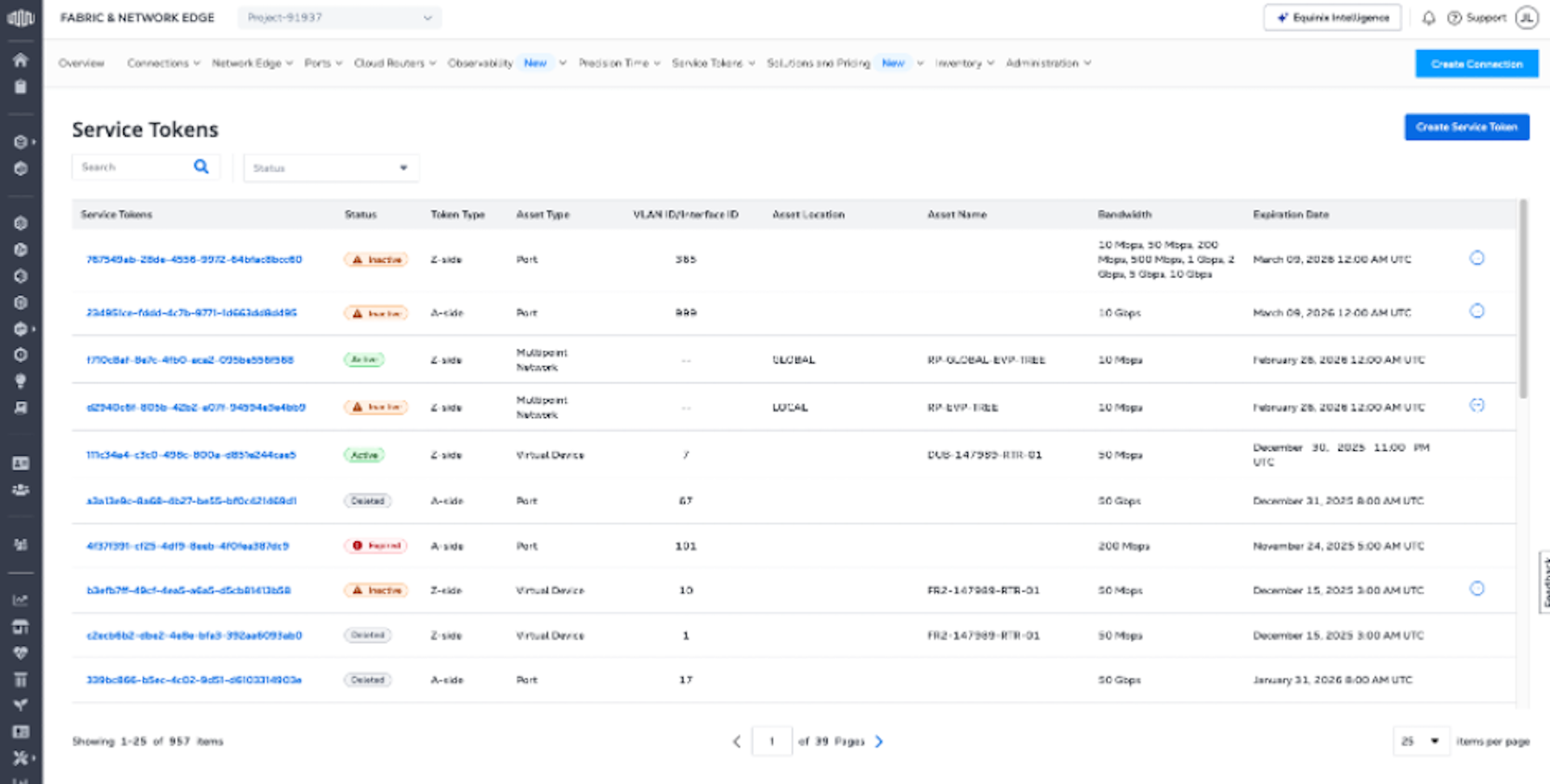 The Service Token Inventory provides a single location for viewing, editing, and deleting all of the A-side and Z-side service tokens you’ve created.