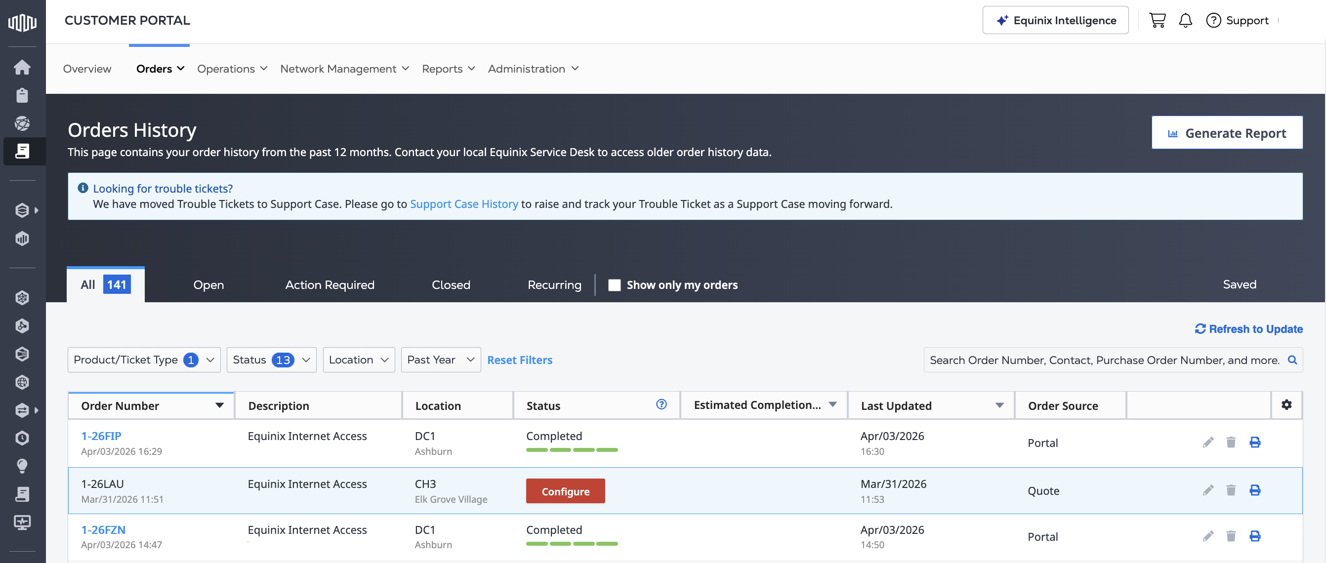 From the Colocation Dashboard, click on Orders, then Order History.