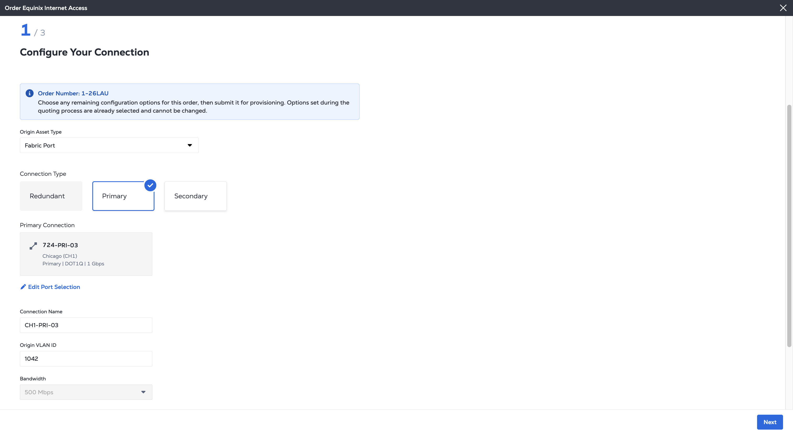 - Fabric Port - Choose the Port to use for your Internet Access service. Enter a Connection Name and the Origin VLAN ID.