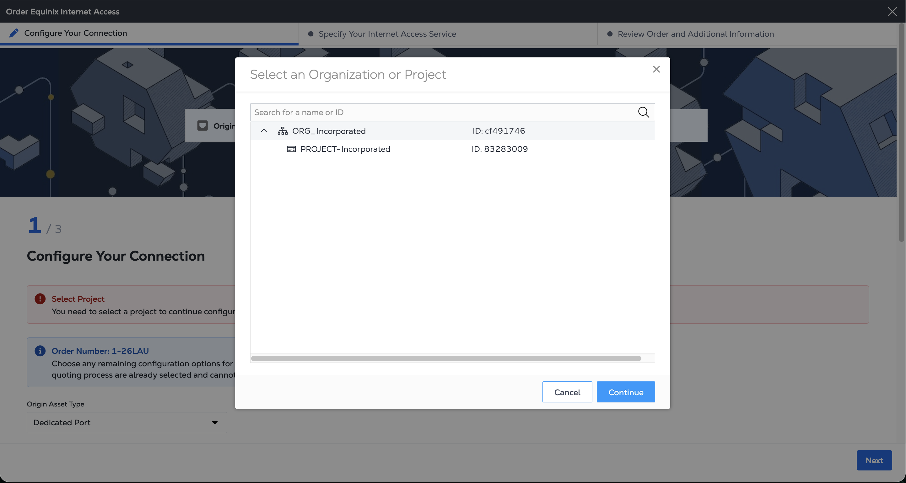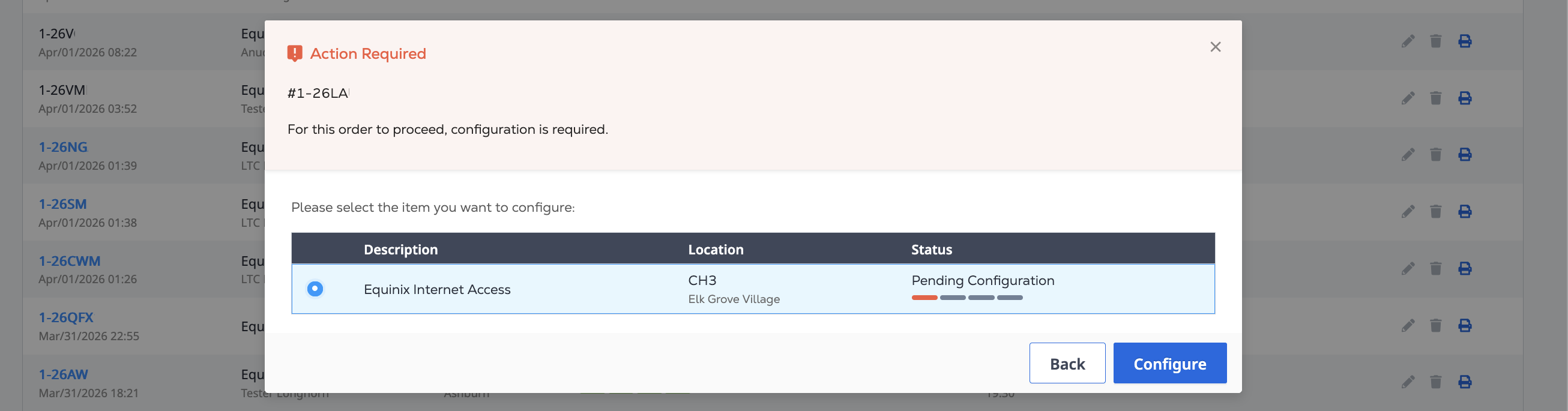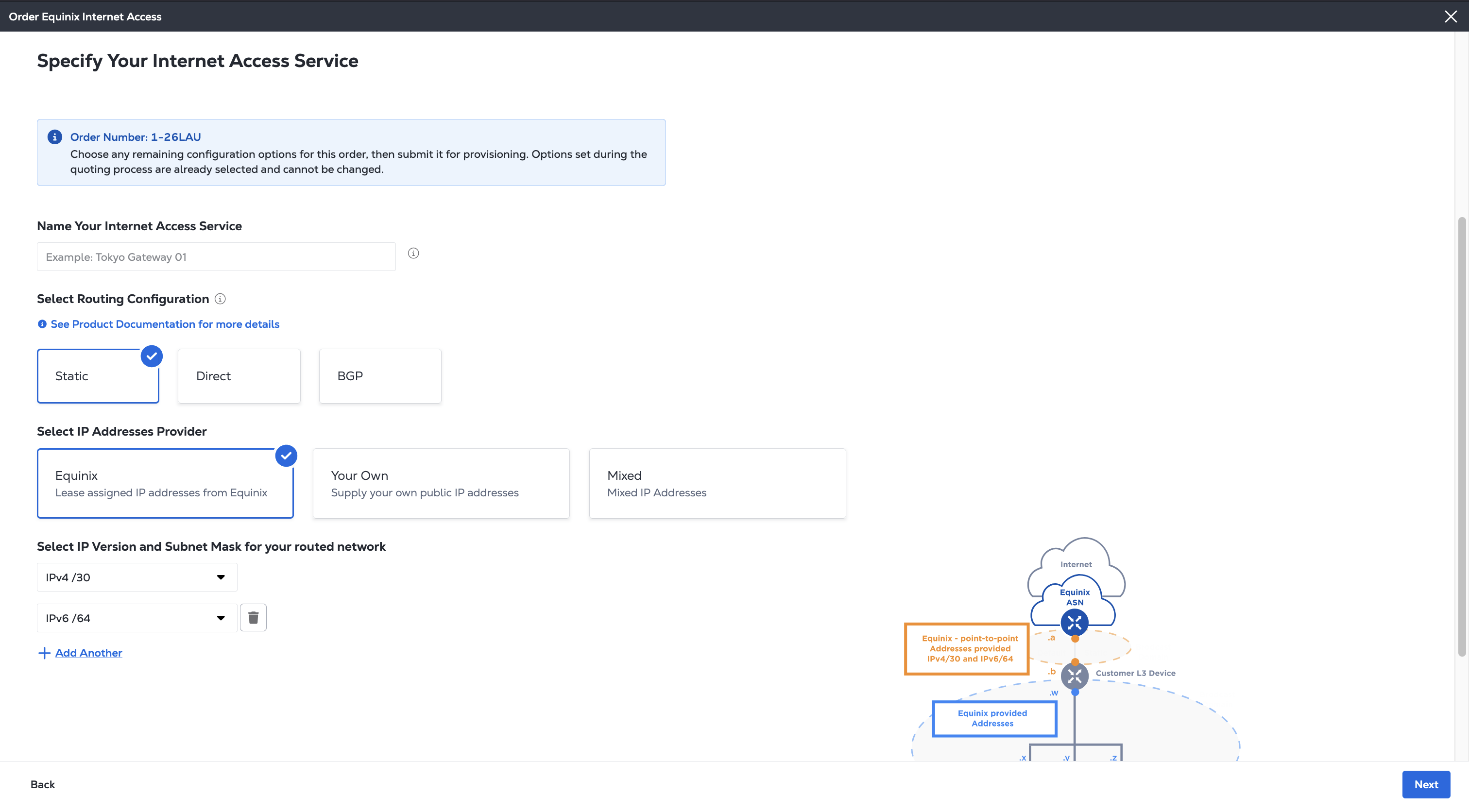 Equinix offers ordering Internet Access through a formal quote and offline ordering process through the Equinix Sales team. Once you have received and accepted the quote, you get an order confirmation with a link to the Customer Portal where you can finish configuring your order and create your service.