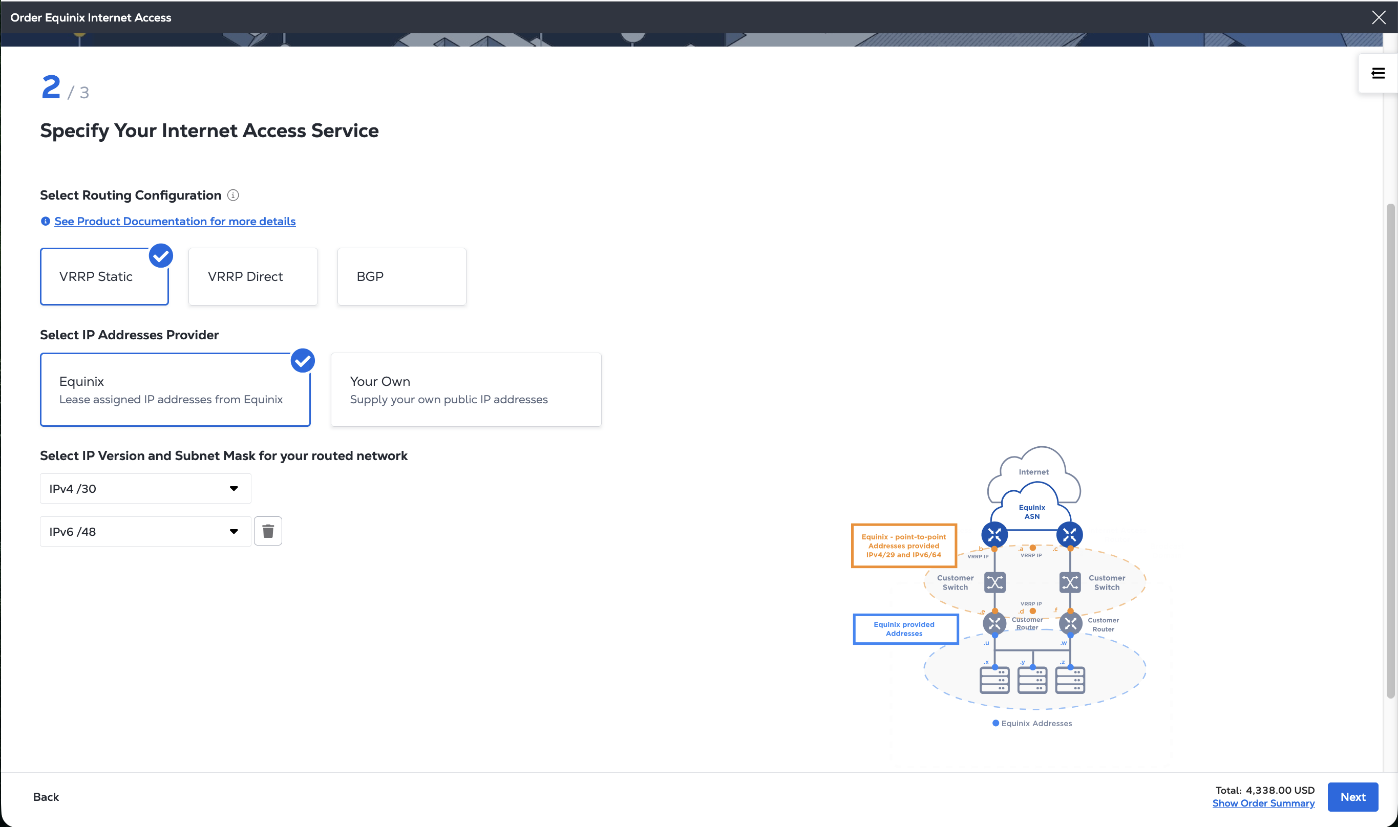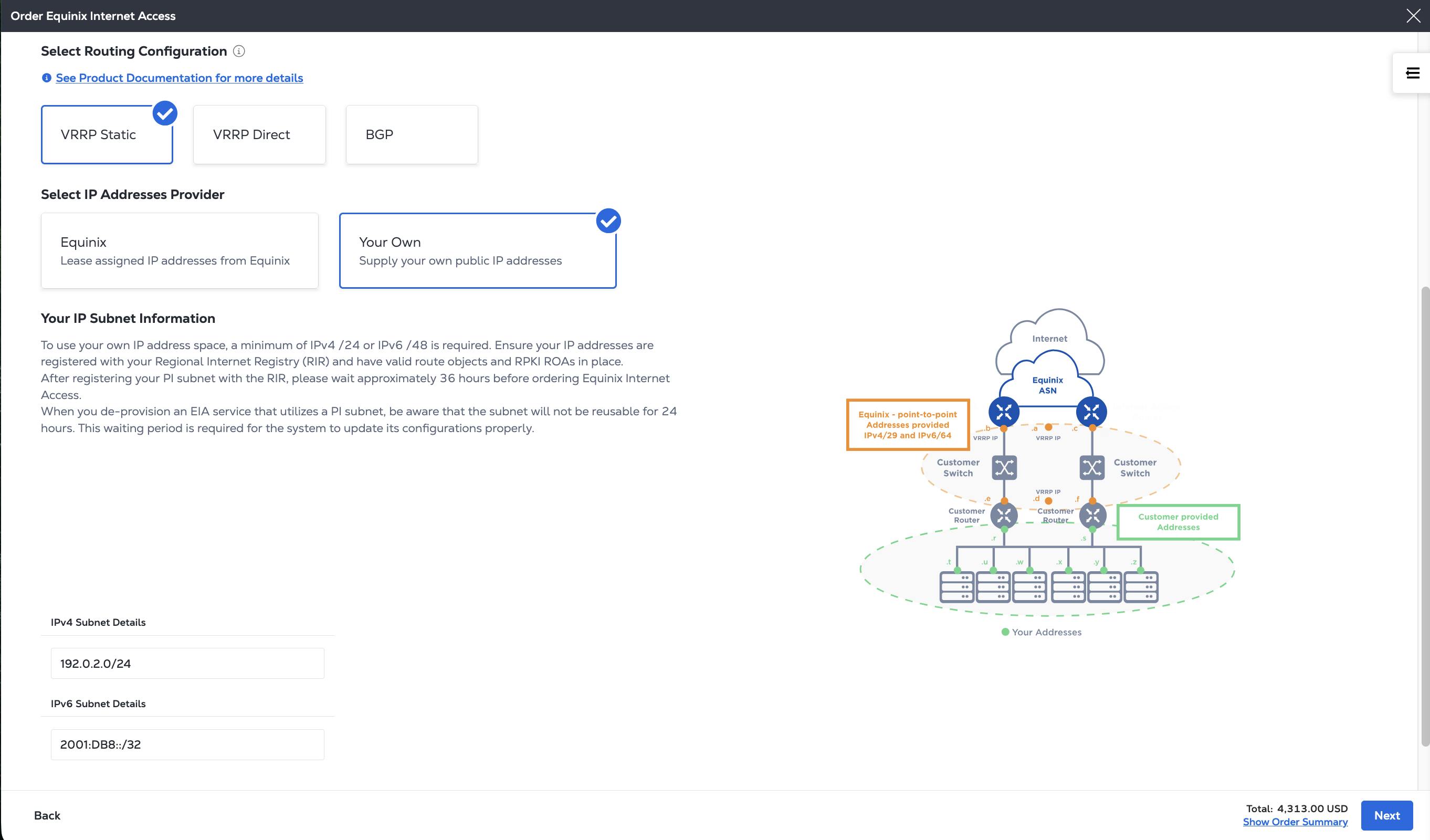Equinix-provided IPs - Equinix assigns and leases public IP addresses to you. This option is ideal if you do not have your own IP space or want a quick setup. From the drop-down menu, choose any combination of: