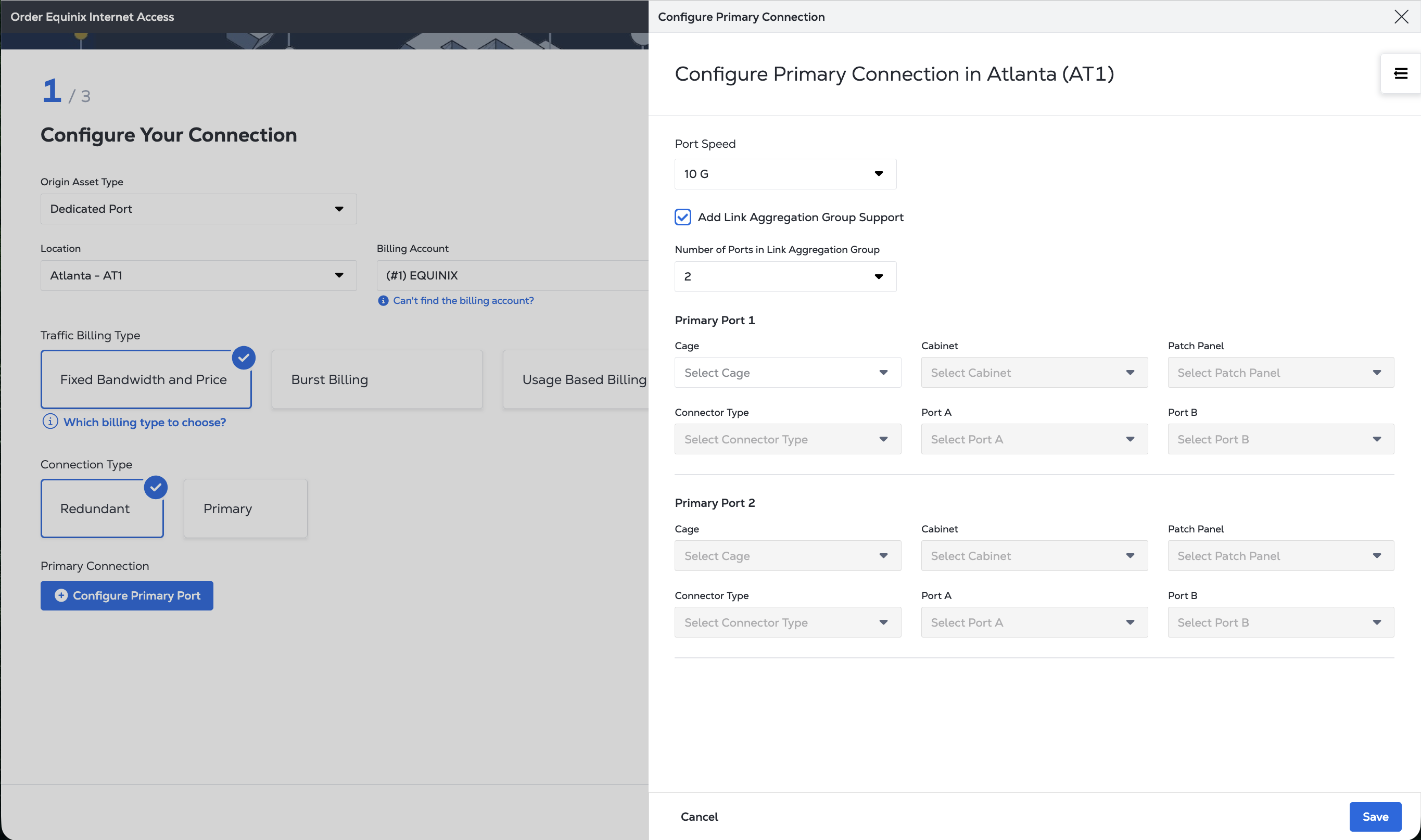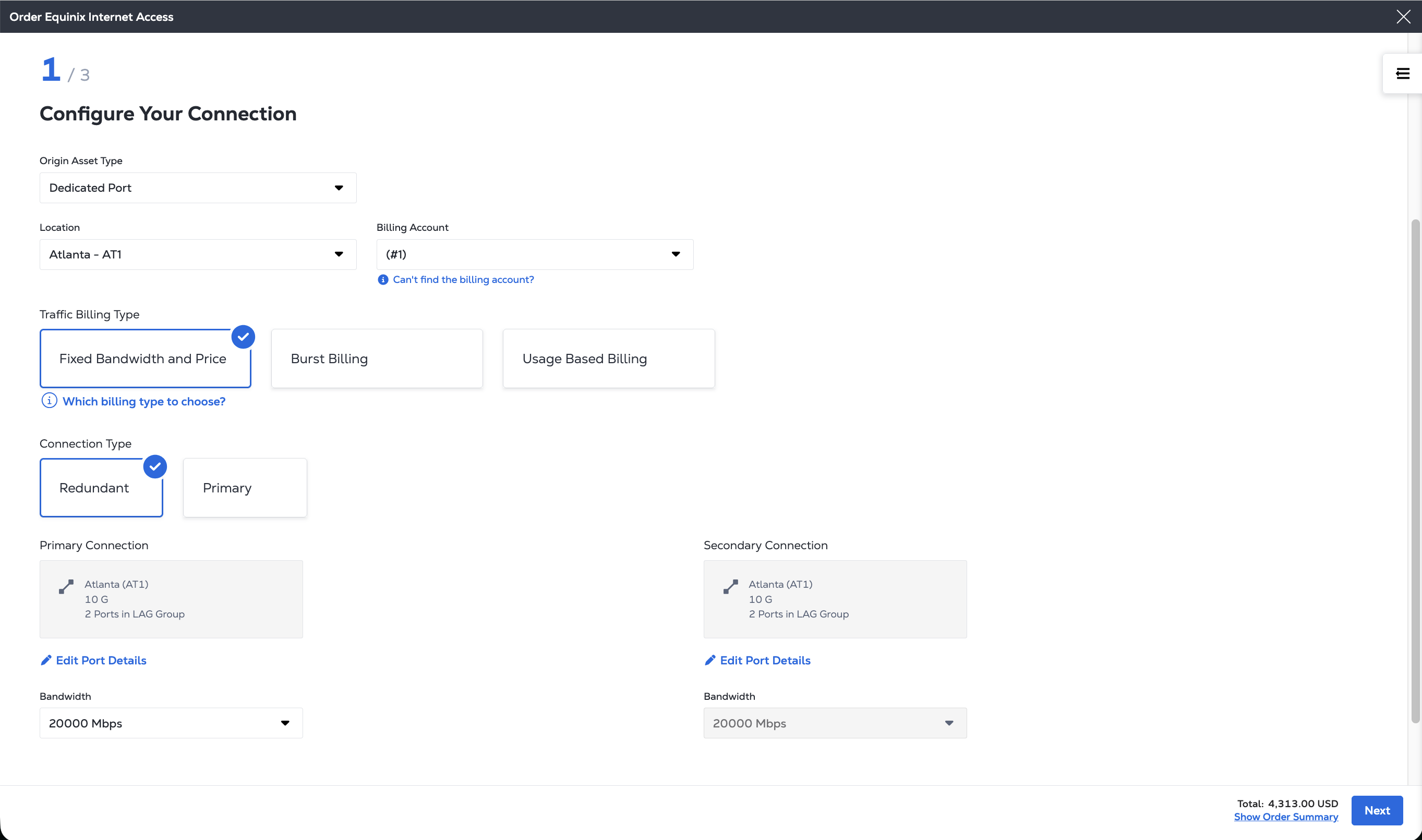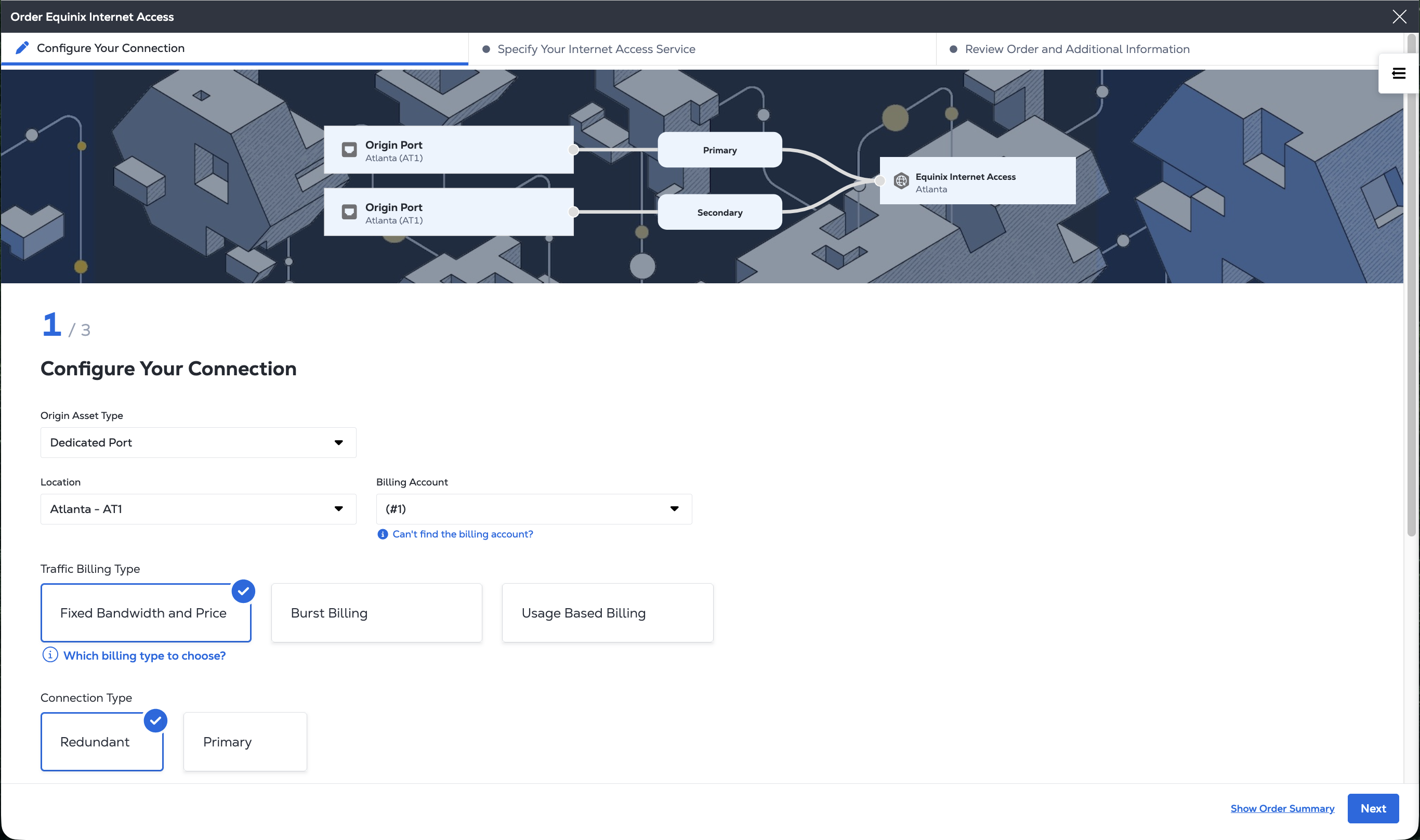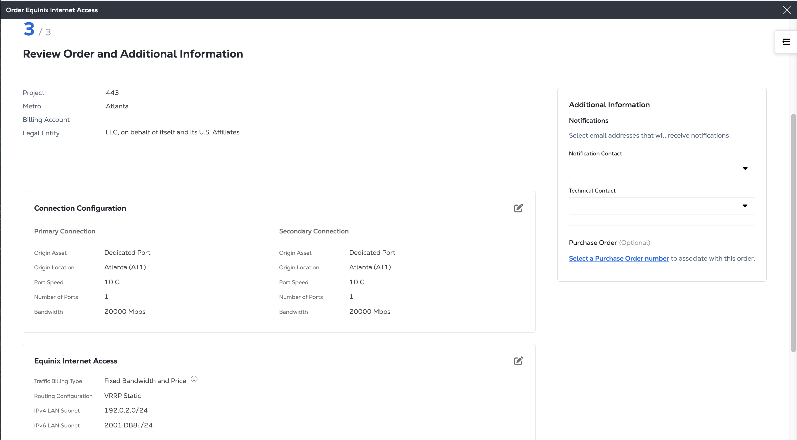 Review the information in the Connection Configuration and Equinix Internet Access sections.