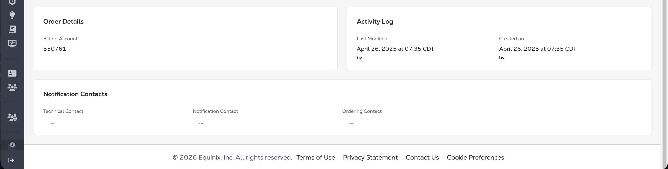 Notification Contacts - The Notification Contacts panel contains the contact email address for the technical contacts, notification contacts, and ordering contacts for this service.
