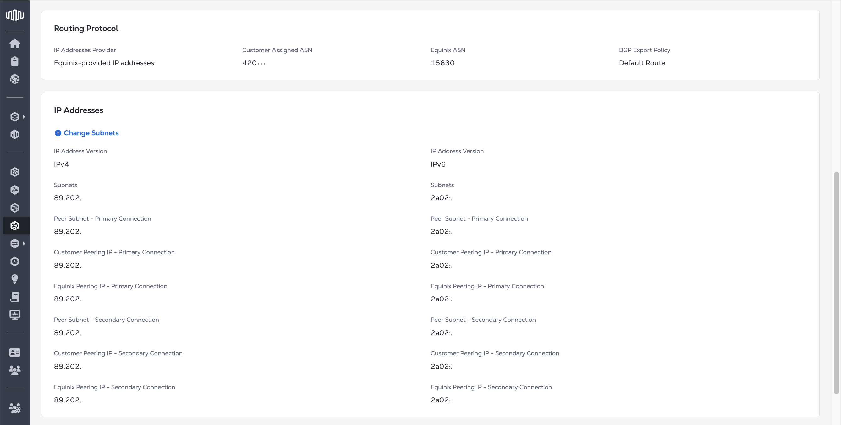 IP Addresses - The IP Addresses panel contains your IP address, IP block, and IP subnets. To manage your IP blocks, click Change Subnets. For more information, see Manage IP Blocks (Add / Delete)