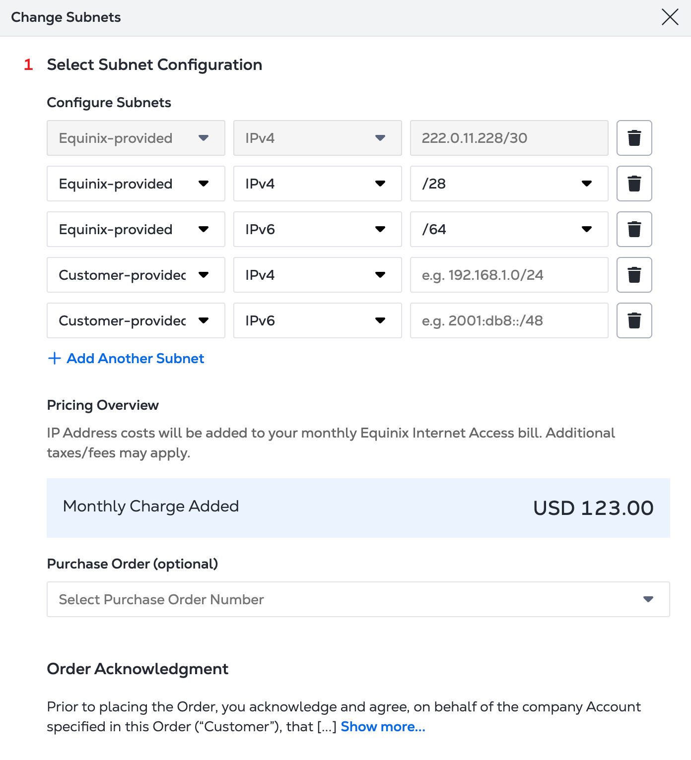 - To Add: Click + Add Another Subnet. Select whether the subnet is Equinix-provided (PA) or Customer-provided (PI), choose the IP version, and enter the CIDR or desired prefix length.