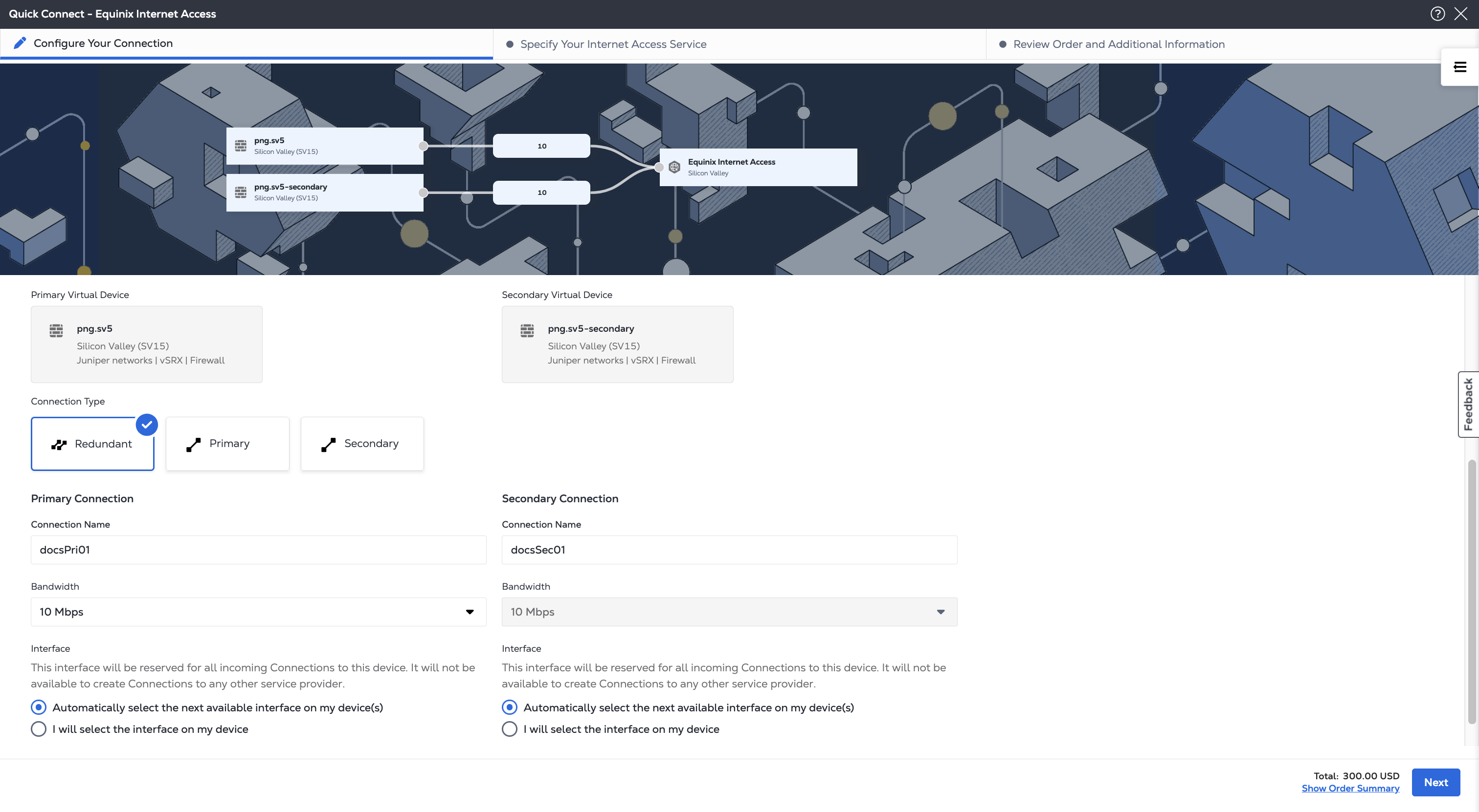 Give your Connection(s) a name, a VLAN ID, and choose the bandwidth for your service. If you are ordering a redundant connection, the bandwidth is the same for both the Primary and the Secondary connection.