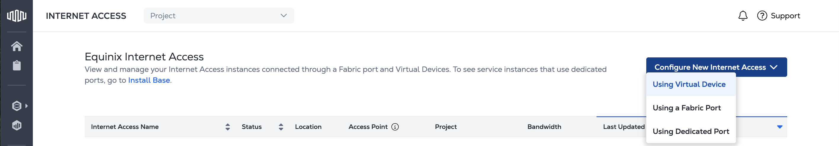 On the Equinix Internet Access screen, click Configure New Internet Access, and select Using a Virtual Device.