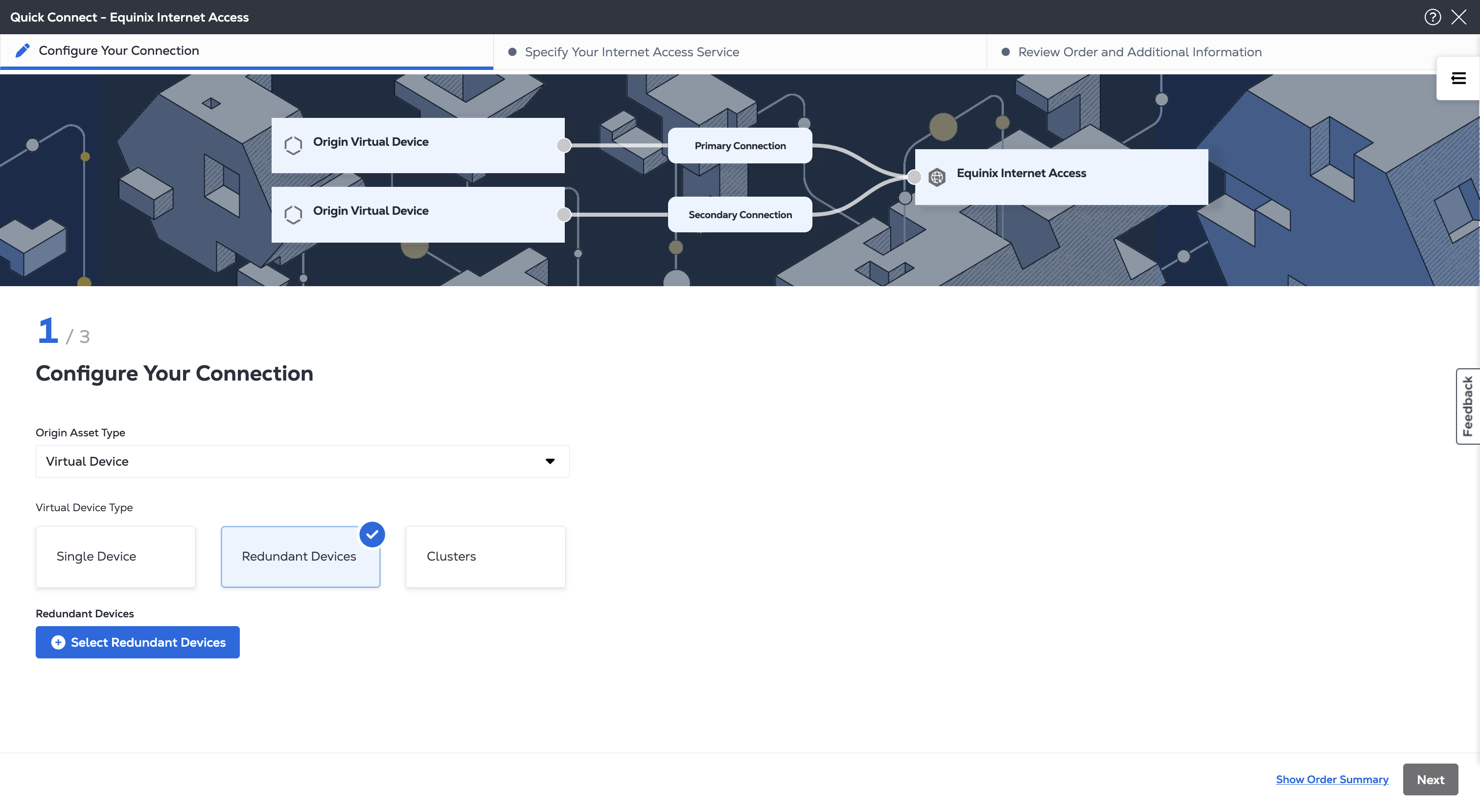 Equinix Internet Access supports single and dual connections on Network Edge devices, including a single independent connection for each device in a cluster pair or a redundant pair, and end-to-end resilient secondary (redundant) connections for clusters and redundant devices.
