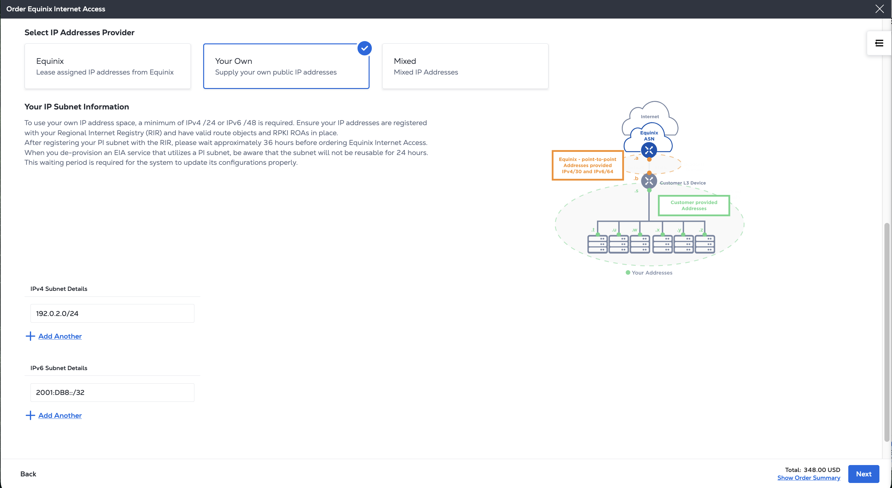 If you are in the APAC region leasing IPv4 subnets from Equinix, answer the IP Address Request questions and provide the details of your addressing plan.