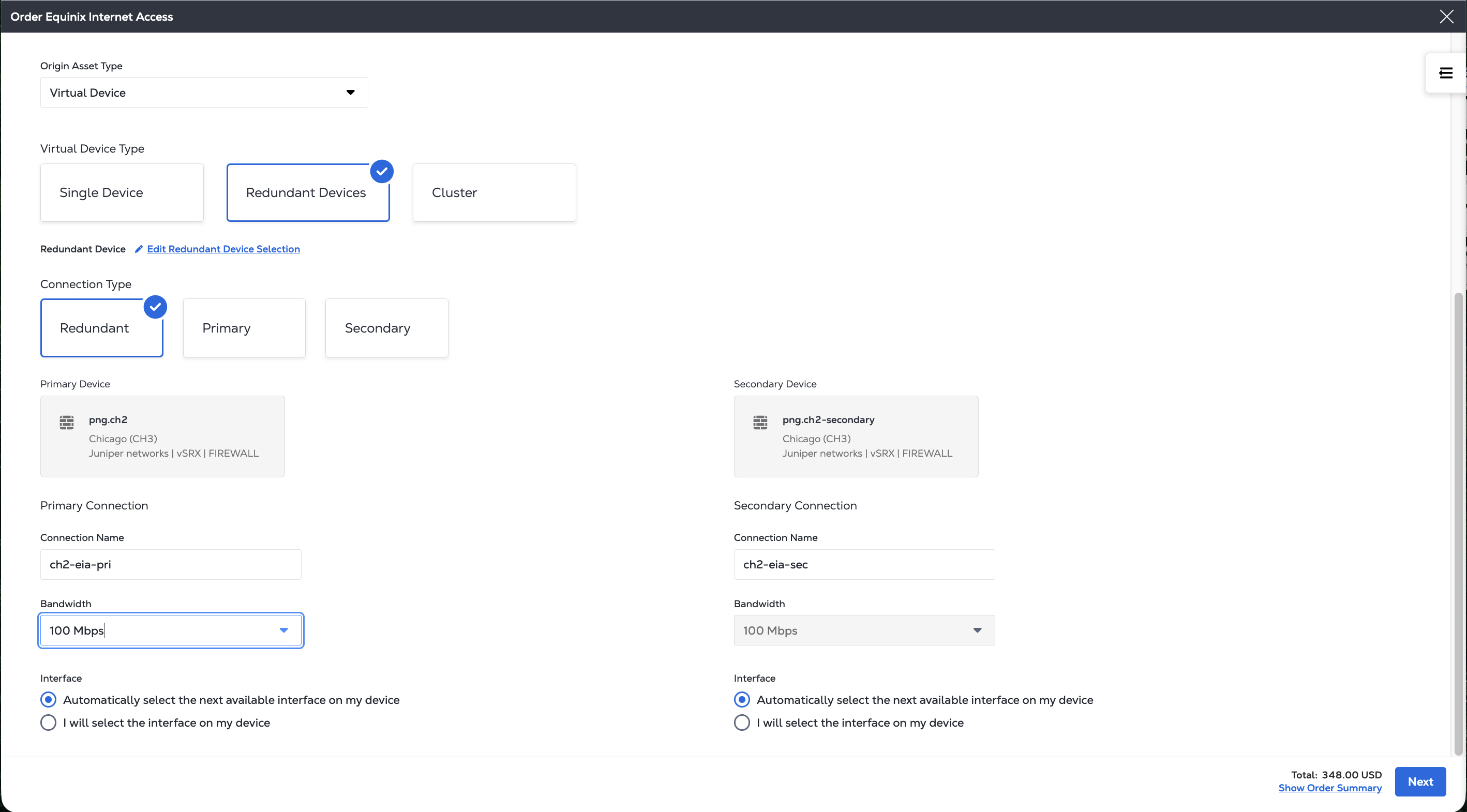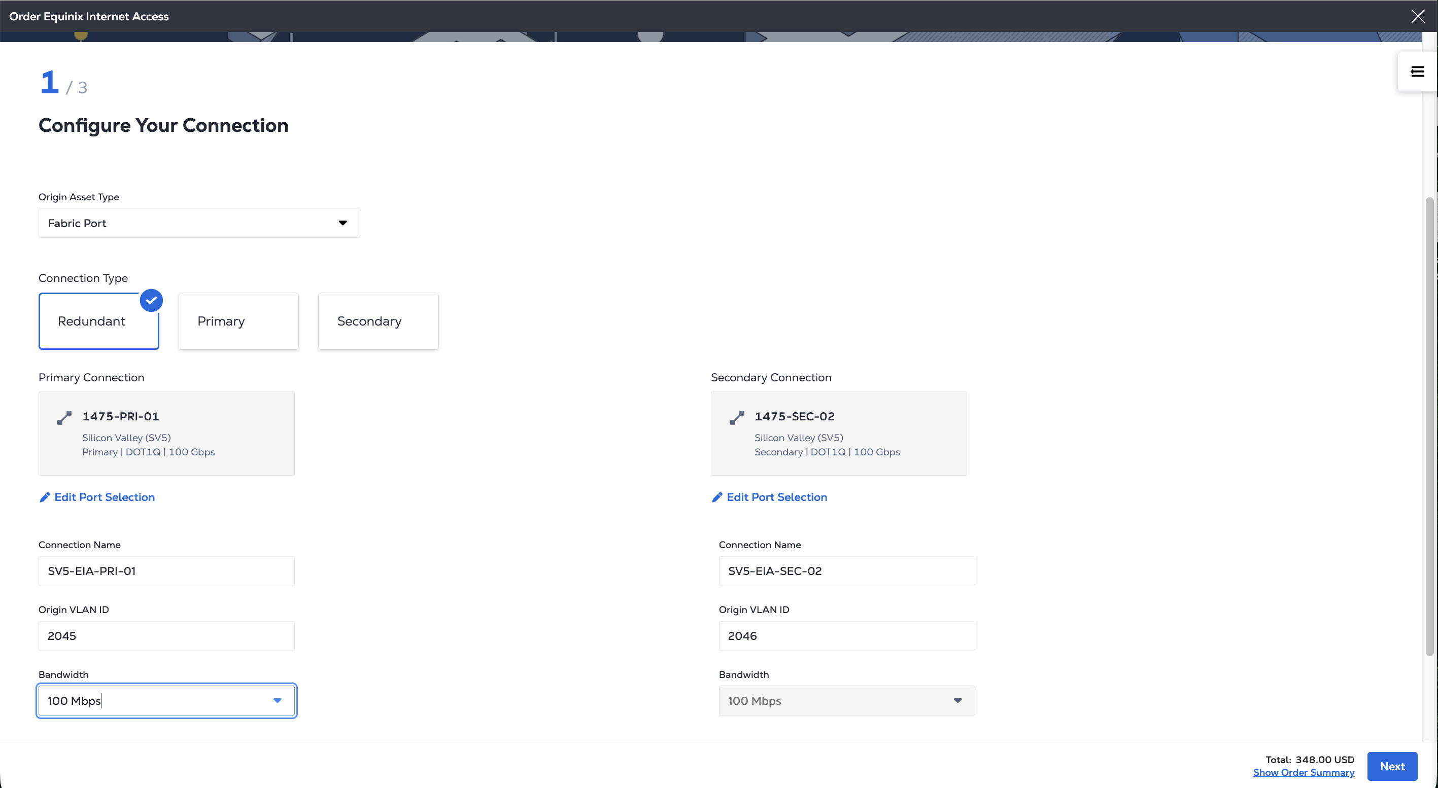 - Select the connection's Bandwidth. If it is a redundant connection, the bandwidth must be the same for both primary and secondary connections.
