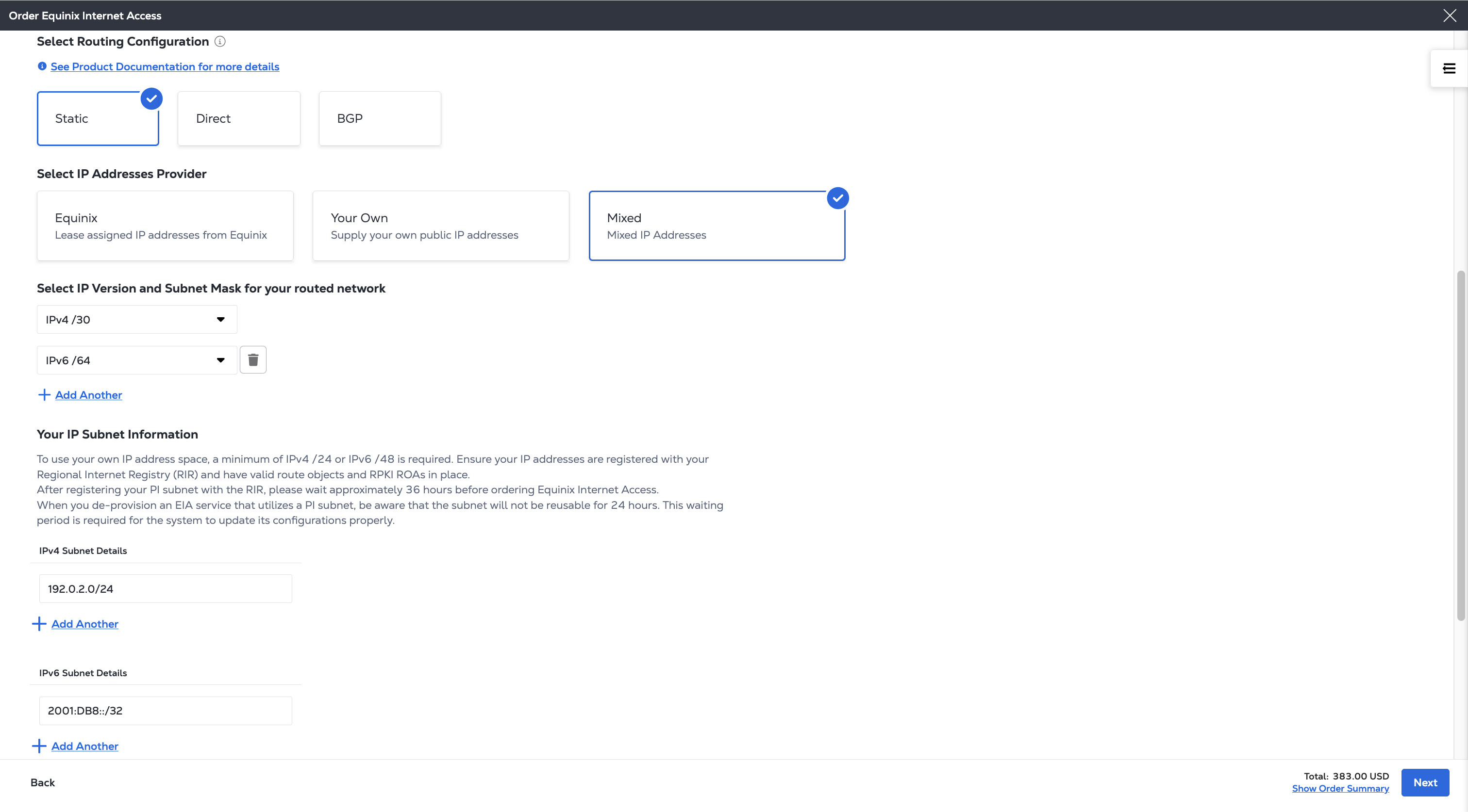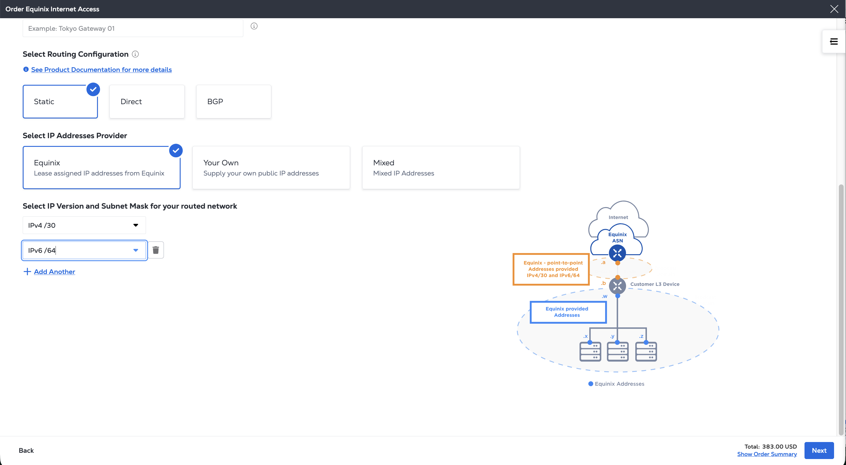 Equinix-provided IPs - Equinix assigns and leases public IP addresses to you. This option is ideal if you do not have your own IP space or want a quick setup. From the drop-down menu, choose any combination of: