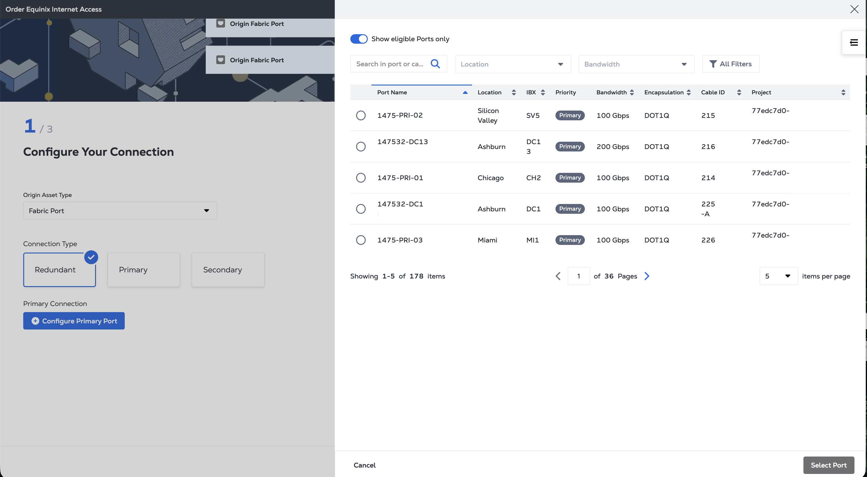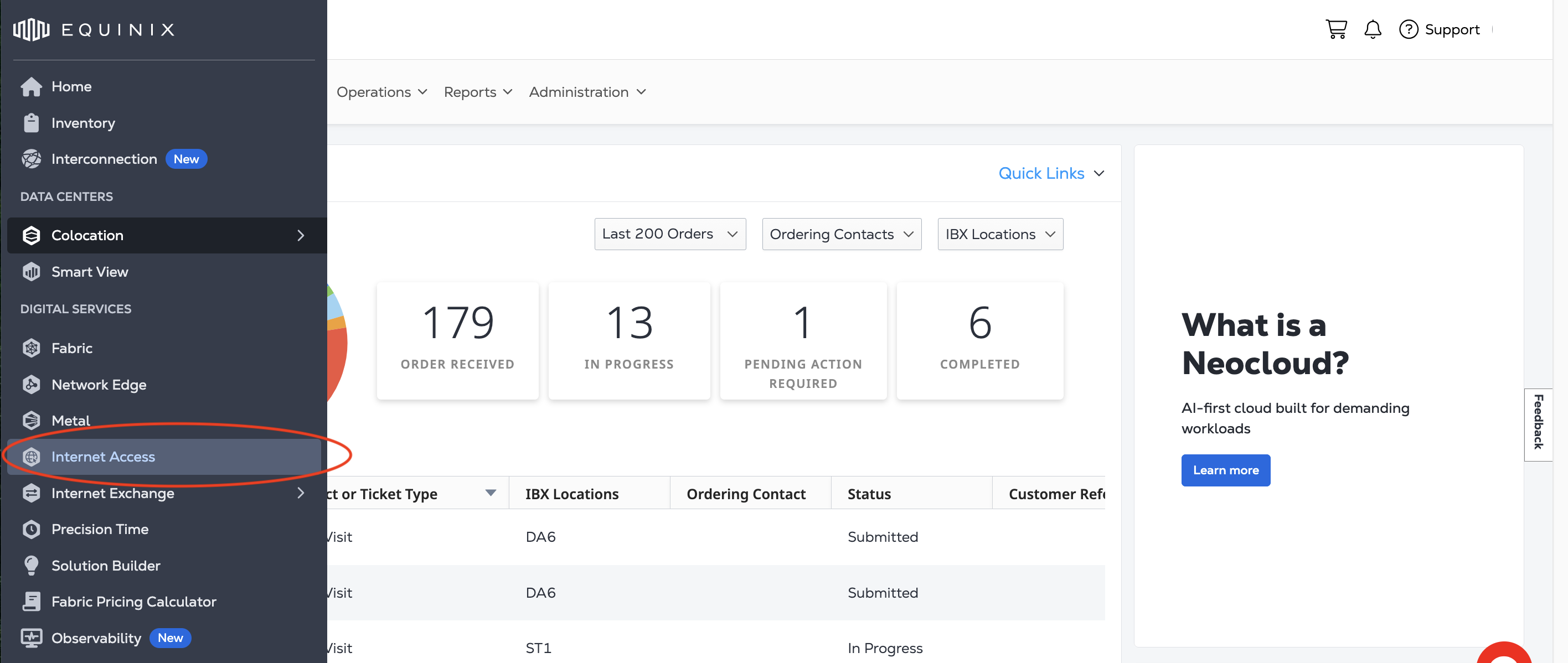Order Internet Access through the Customer Portal for Fabric Ports or Network Edge devices. The following steps guide you through the ordering flow based on the assets that are assigned to your organization, project, and account.