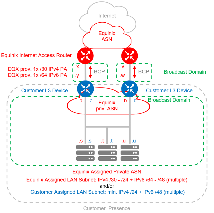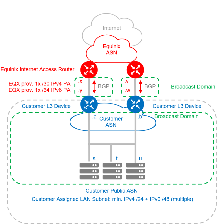 By default, Equinix assigns a private Autonomous System Number (ASN) for the LAN, and two /30 IPv4 WAN subnets and two /64 IPv6 WAN subnets. A pair of Layer 3 devices for the dual-homed setup is required.