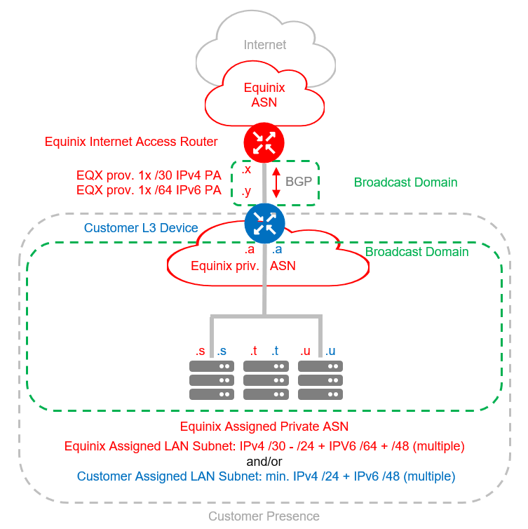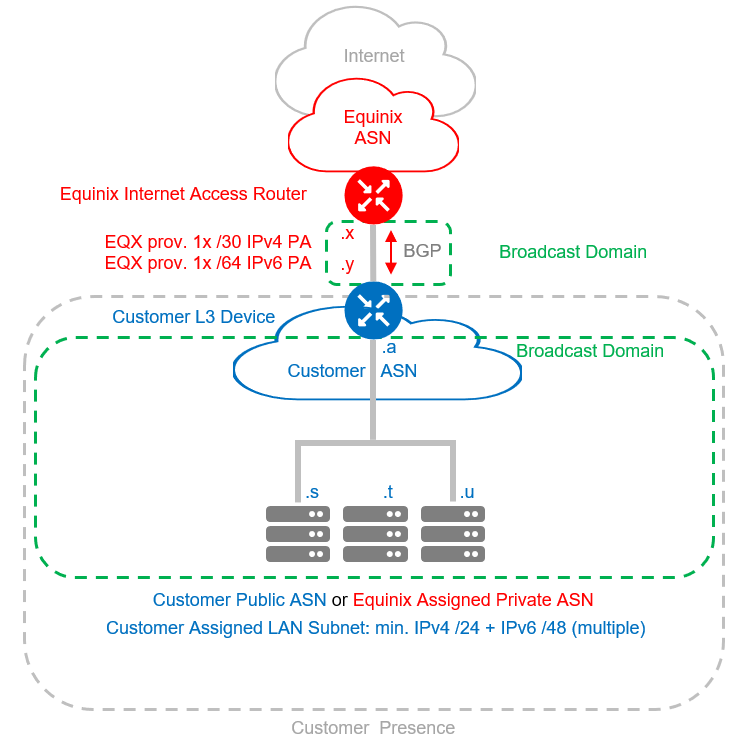 Provided by the customer, IP addresses must be at least IPv4 /24 or IPv6 /48. For customer-assigned IPs, customers can use either their own public ASN (only for EIA over Dedicated variant) or a private ASN assigned by Equinix.