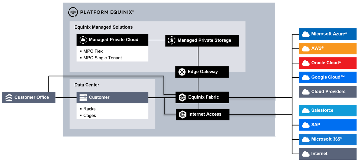 - Direct connectivity (no egress fees) for private connections to colocation and Managed Private Cloud via Equinix Fabric®.