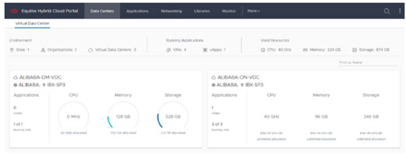 The dashboard shows a summary of your Virtual Data Centers, which may vary according to your resource pool and contracting model of the Equinix Hybrid Cloud product.