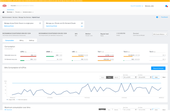 By default, the Equinix Hybrid Cloud Portal displays the vCPU quota in GHz format, where this value is based on the pool of contracted vCPUs. To check the current consumption of resources and their quotas, access the MSP portal (Global Managed Services Portal), where the values are synchronized every hour.