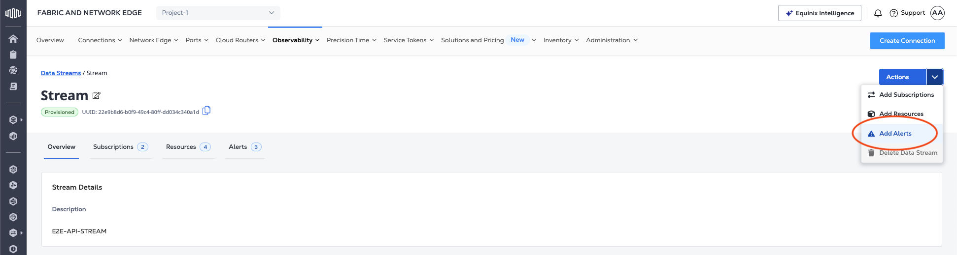 On the Stream Details page, from the Actions drop-down menu, click Add Alerts.