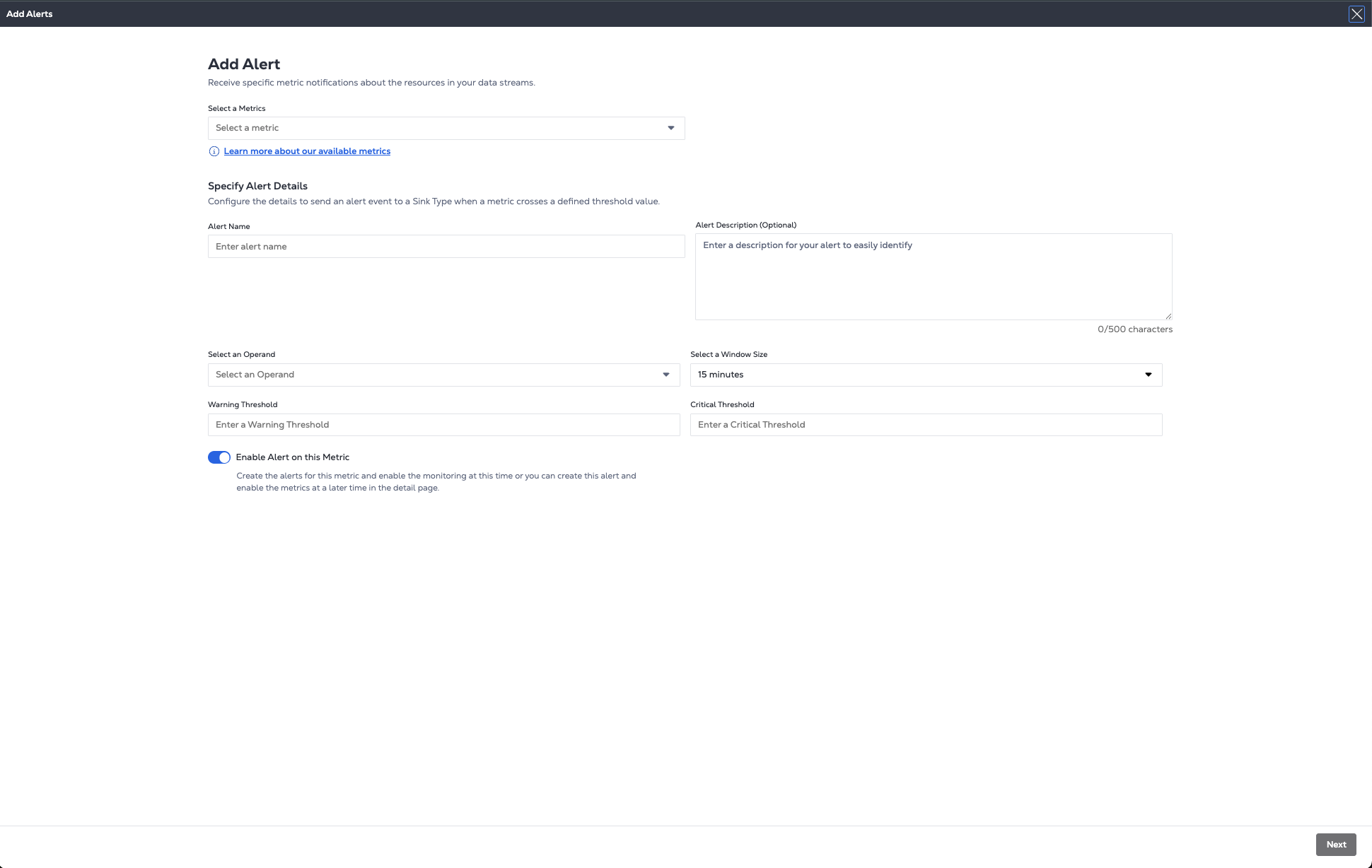 For Streams where you have attached Metros, you can create smart alerts for latency thresholds. These AI-powered alerts analyze historical latency data across your metro locations using machine learning to establish baseline performance and generate smart alert thresholds, eliminating the need for manual alert configuration.