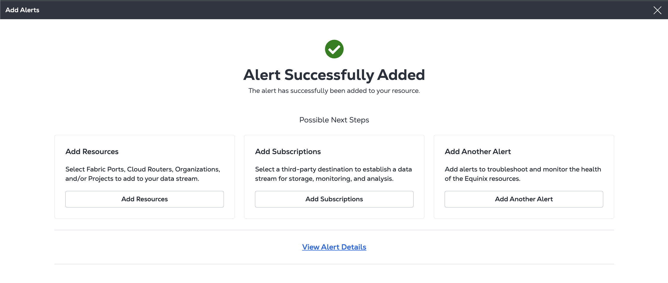 From the confirmation screen, you can add more resources to your alert, add a subscription to your stream to receive your alert, or add another alert. To see the details of your new alert, click View Alert Details.