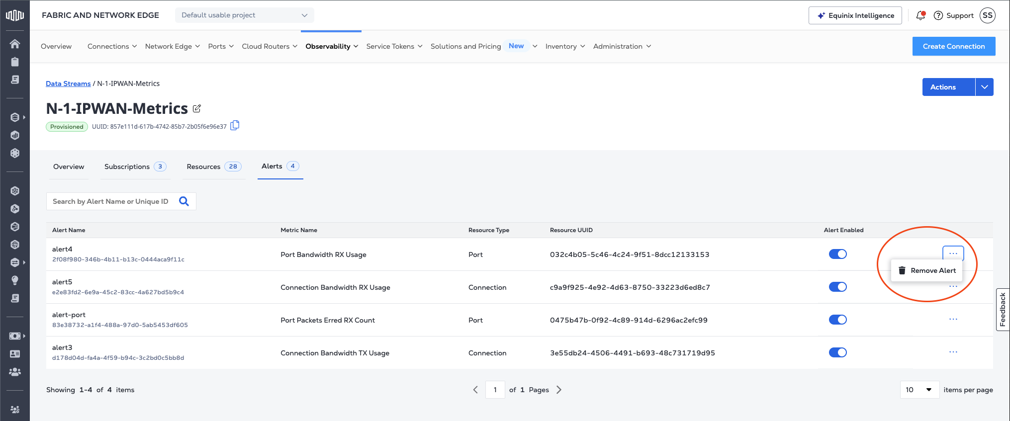 To delete an Alert, send a DELETE request to the /fabric/v4/streams/{streamId}/alertRules/{alertRuleId} endpoint.